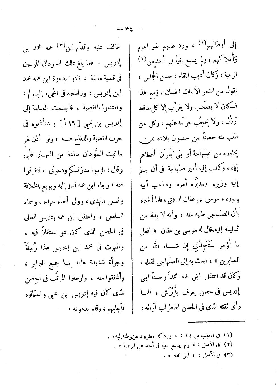 إلى أوطانهم، ورد عليهم ضياعهم وأملاكهم، ولم يسمع بغيا في أحد من الرعية، وكان أديب اللقاء، حسن المجلس، يقول من الشعر الأبيات الحسان؛ ومع هذا فكان لا يصحب ولا يقرب إلا كل ساقط رذل، ولا يحجب حرمه عنهم، وكل من طلب منه حصناً من حصون بلاده ممن يجاوره من صنهاجة أو بني يفرن أعطاهم إياه، وكتب إليه أمير صنهاجة في أن يسلم إليه وزيره ومدبره أمره وصاحب أبيه وجده؛ موسى بن عفان السبتي، فلما أخبره بأن الصنهاجي طلبه منه، وأنه لا بدله من تسليمه إليه، قال له موسى بن عفان أفعل ما تؤثر ستجدني إن شاء الله من الصابرين، فبعت به إلى الصنهاجي فقتله، وكان قد اعتقل ابني عمه محمداً وحسنا ابني إدريس في حصن يعرف بأيرس، فلما رأى ثقته الذي في الحصن اضطراب آرائه، خالف عليه، وقدم ابن عمه محمد بن إدريس، فلما بلغ ذلك السودان المرتبين في قصبة مالقة، نادوا بدعوة ابن عمه محمد بن إدريس، وراسلوه في المجيء إليهم، وامتنعوا بالقصبة، فاجتمعت العامة إلى إدريس بن يحيى واستأذنوه في حرب القصبة والدفاع عنه، ولو أذن لهم ما ثبت السودان ساعة من النهار فأبى وقال: ألزموا منازلكم ودعوني، فتفرقوا عنه، وجاء ابن عمه فسلم إليه، وبويع بالخلافة وتسمى المهدي، وولي أخاه عهده، وسماه السامي، واعتقل ابن عمه إدريس العالي في الحصن الذي كان هو معتقلاً فيه، وظهرت في محمد ابن إدريس هذا رجلة وجرأة شديدة هابه بها جميع البرابر، وأشفقوا منه، وراسلوا المرتب في الحصن الذي كان فيه إدريس بن يحيى واستمالوه فأجابهم، وقام بدعوته.
