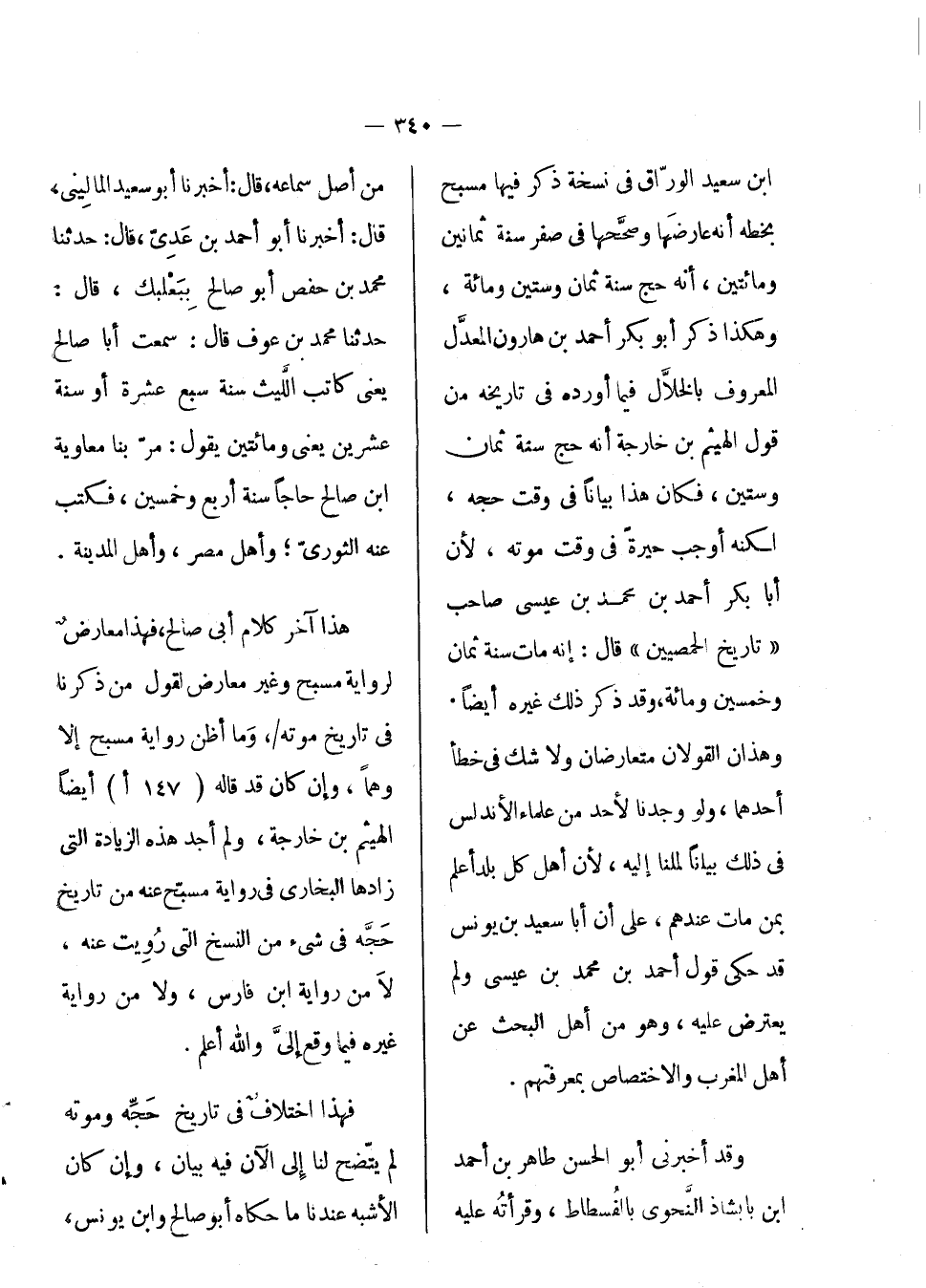 بن سعيد الوراق في نسخة ذكر فيها مسبح بخطه أنه عارضها وصححها في صفر سنة ثمانين ومائتين، أنه حج سنة ثمان وستين ومائة، وهكذا ذكر أبو بكر أحمد بن محمد بن هارون المعدل المعروف بالخلال فيما أورده في تاريخه من قول الهيثم ابن خارجة أنه حج سنة ثمان وستين، فكان هذا بياناً في وقت حجه، لكنه أوجب حيرة في وقت موته، لأن أبا بكر أحمد بن محمد بن عيسى صاحب تاريخ الحمصيين قال: إنه مات سنة ثمان وخمسين ومائة، وقد ذكر ذلك غيره أيضاً. وهاذان القولان متعارضان ولا شك في خطأ أحدهما، ولو وحدنا لأحد من علماء الأندلس في ذلك بياناً لملنا إليه، لأن أهل كل بلد أعلم بمن مات عندهم، على أن أبا سعيد بن يونس قد حكى قول أحمد بن محمد بن عيسى ولم يعترض عليه، وهو من أهل البحص عن أهل المغرب والاختصاص بمعرفتهم.