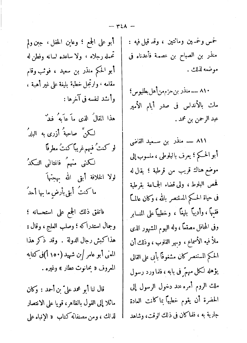 منذر بن سعيد القاضي أبو الحكم، يعرف بالبلوطي، منسوب إلى موضع هناك قريب من قرطبة، يقال له فحص البلوط، ولى قضاء الجماعة بقرطبة في حياة الحكم المستنصر بالله، وكان عالماً فقيهاً، وأديباً بليغاً، وخطيباً على المنابر وفي المحافل مصقعاً، وله اليوم المشهور الذي ملأ فيه الأسماع، وبهر القلوب؛ وذلك أن الحكم المستنصر كان مشغوفاً بأبي على القالي يؤهله لكل مهم في بابه، فلما ورد رسول ملك الرم أمره عند دخول الرسول إلى الحضرة أن يقوم خطيباً بما كانت العادة جارية به، فلما كان في ذلك الوقت، وشاهد أبو علي الجمع، وعاين الحفل، جبن ولم تحمله رجلاه، ولا ساعده لسانه وفطن له أبو الحكم منذر بن سعيد، فوثب وقام مقامه، وارتجل خطبة بليغة على غير أهبة، وأنشد لنفسه في آخرها: