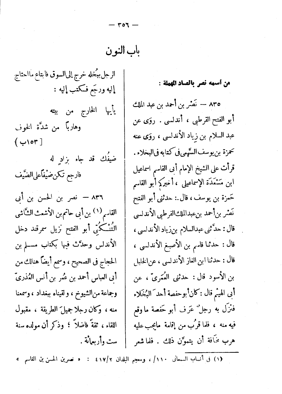 نصر بن أحمد بن عبد الملك أبو الفتح القرطبي، أندلسي. روى عن عبد السلام بن زياد الأندلسي، روى عنه حمزة بن يوسف السهمي في كتابه في البخلاء. قرأت على الشيخ الإمام أبي القاسم إسماعيل بن مسعدة الإسماعيلي، أخبركم أبو القاسم حمزة بن يوسف، قال: حدثني أبو الفتح نصر بن أحمد بن عبد الملك القرطبي الأندلسي قال: حدثني عبد السلام بن زياد الأندلسي، قال: حدثنا قاسم بن الأصبغ الأندلسي، قال: حدثنا ابن الغاز الأندلسي، عن الخليل بن الأسود قال: حدثني العمري، عن أبي الهيثم قال: كان أبو حفصة أحد البخلاء فنزل به رجل عرف أبو حفصة ما وقع فيه منه، فلما قرب من إقامة ما يجب عليه هرب مخافة أن يتمون ذلك. فلما شعر الرجل ببخله خرج إلى السوق فابتاع ما احتاج إليه ورجع فكتب إليه: