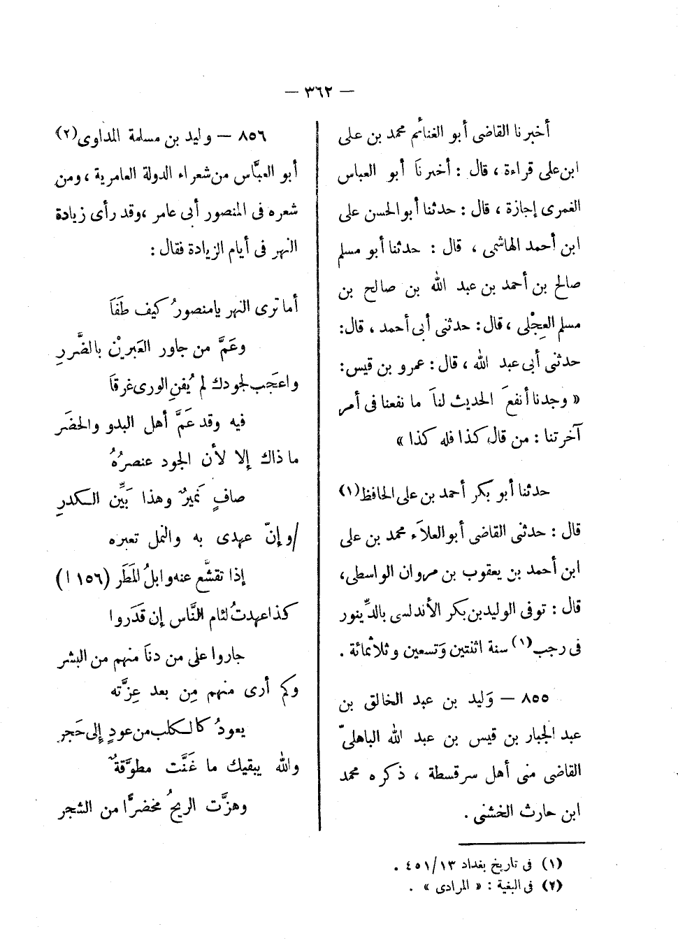 وليد بن مسلمة المدادي أبو العباس من شعراء الدولة العامرية، ومن شعره في المنصور أبي عامر، وقد رأى زيادة النهر في أيام الزيادة: