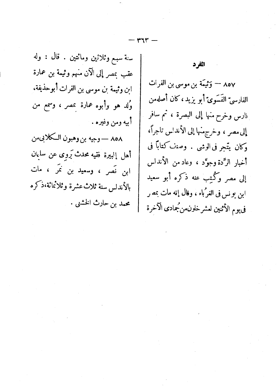 المفرد وثيمة بن موسى بن الفرات الفارسي الفسوي أبو يزيد، كان أصله من فارس وخرج منها إلى البصرة، ثم سافر إلى مصر، وخرج منها إلى الأندلس تاجراً، وكان يتجر في الوشى. وصنف كتاباً في أخبار الردة وجود، وعاد من الأندلس إلى مصر وكتب عنه ذكره أبو سعيد بن يونس في الغرباء، وقال إنه مات بمصر في يوم الأثنين لعشر خلون من جمادى الآخرة سنة سبع وثلاثين ومائتين. قال: وله عقب بمصر إلى الآن منهم وثيمة بن عمارة بن وثيمة بن موسى بن الفرات أبو حذيفة، ولد هو وأبوه عمارة بمصر، وسمع من أبيه ومن وغيره.