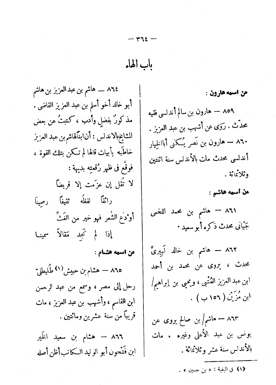 هشام بن حبيش طليطلي رحل إلى مصر وسمع من عبد الرحمن بن القاسم، وأشهب بن عبد العزيز، مات قريباً من سنة عشرين ومائتين.