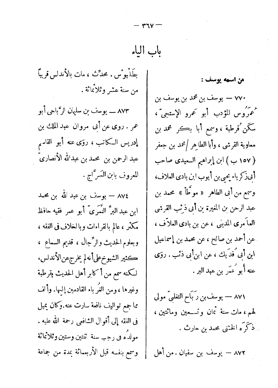 يوسف بن عبد الله بن محمد بن عبد البر النمري أبو عمر فقيه حافظ مكثر، عالم بالقراآت وبالخلاف في الفقه، وبعلوم الحديث والرجال، قديم السماع، كثير الشيوخ على أنه لم يخرج عن الأندلس، لكنه سمع من أكابر أهل الحديث بقرطبة وغيرها، ومن الغرباء القادمين إليها. وألف مما جمع تواليف نافعة سارت عنه. وكان يميل في الفقه إلى اقوال الشافعي رحمة الله عليه. مولده في رجب سنة اثنتين وستين وثلاث مائة، وسمع بنفسه قبل الأربع مائة بمدة من جماعة