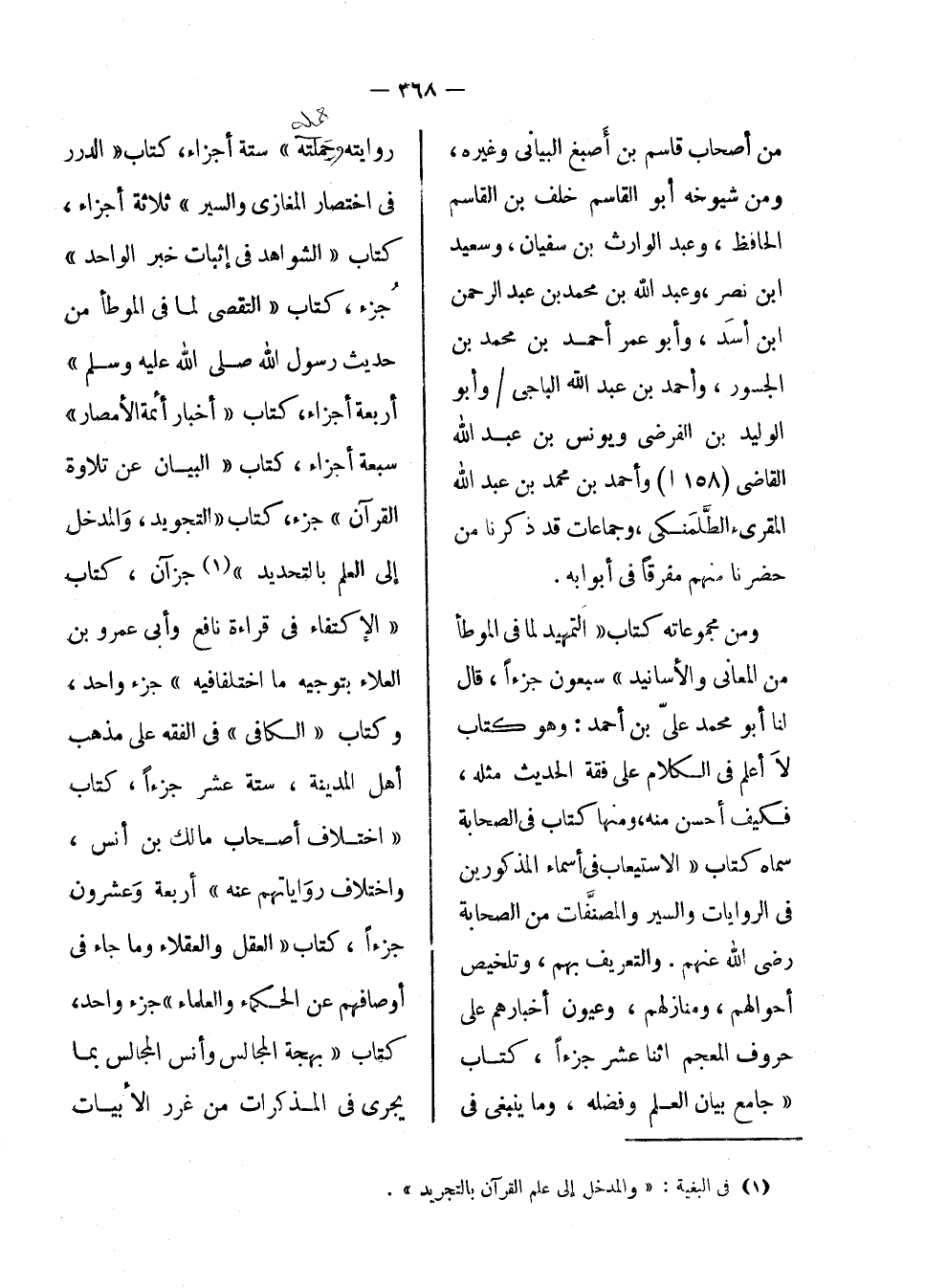 ومن مجموعاته كتاب التمهيد لما في الموطأ من المعاني والأسانيد سبعون جزءاً، قال لنا أبو محمد علي بن أحمد: وهو كتاب لا أعلم في الكلام على قه الحديث مثله، فكيف أحسن منه، ومنها كتاب في الصحابة سماه كتاب الاستيعاب في أسماء المذكورين في الروايات والسير والمصنفات من الصحابة رضي الله عنهم، والتعريف بهم، وتلخيص أحوالهم، ومنازلهم، وعيون أخبارهم على حروف المعجم اثنا عشر جزءاً، كتاب جامع بيان العلم وفضله، وما ينبغي في روايته وحمله ستة أجزاء، كتاب الدرر في اختصار المغازي والسير ثلاثة أجزاء، كتاب الشواهد ف إثبات خبر الواحد جزء، كتاب التقصي لما في الموطأ من حديث رسول الله صلى الله عليه وسلم أربعة أجزاء، كتاب أخبار أئمة الأمصار سبعة أجزاء، كتاب البيان عن تلاوة القرآن جزء، كتاب التجويد، والمدخل إلى العلم بالتحديد جزآن، كتاب الإكتفاء في قراءة نافع وأبي عمرو بن العلا بتوجيه ما اختلفا فيه جزء واحد، كتاب الكافي في الفقه على مذهب أهل المدينة، ستة عشر جزءاً، كتاب اختلاف أصحاب مالك بن أنس، واختلاف روياتهم عنه أربعة وعشرون جزاً، كتاب العقل والعقلاء وما جاء في أوصافهم عن الحكماء والعلماء جزء واحد، كتاب بهجة المجالس ونس المجالس بما يجري في المذاكرات من غرر الأبيات
