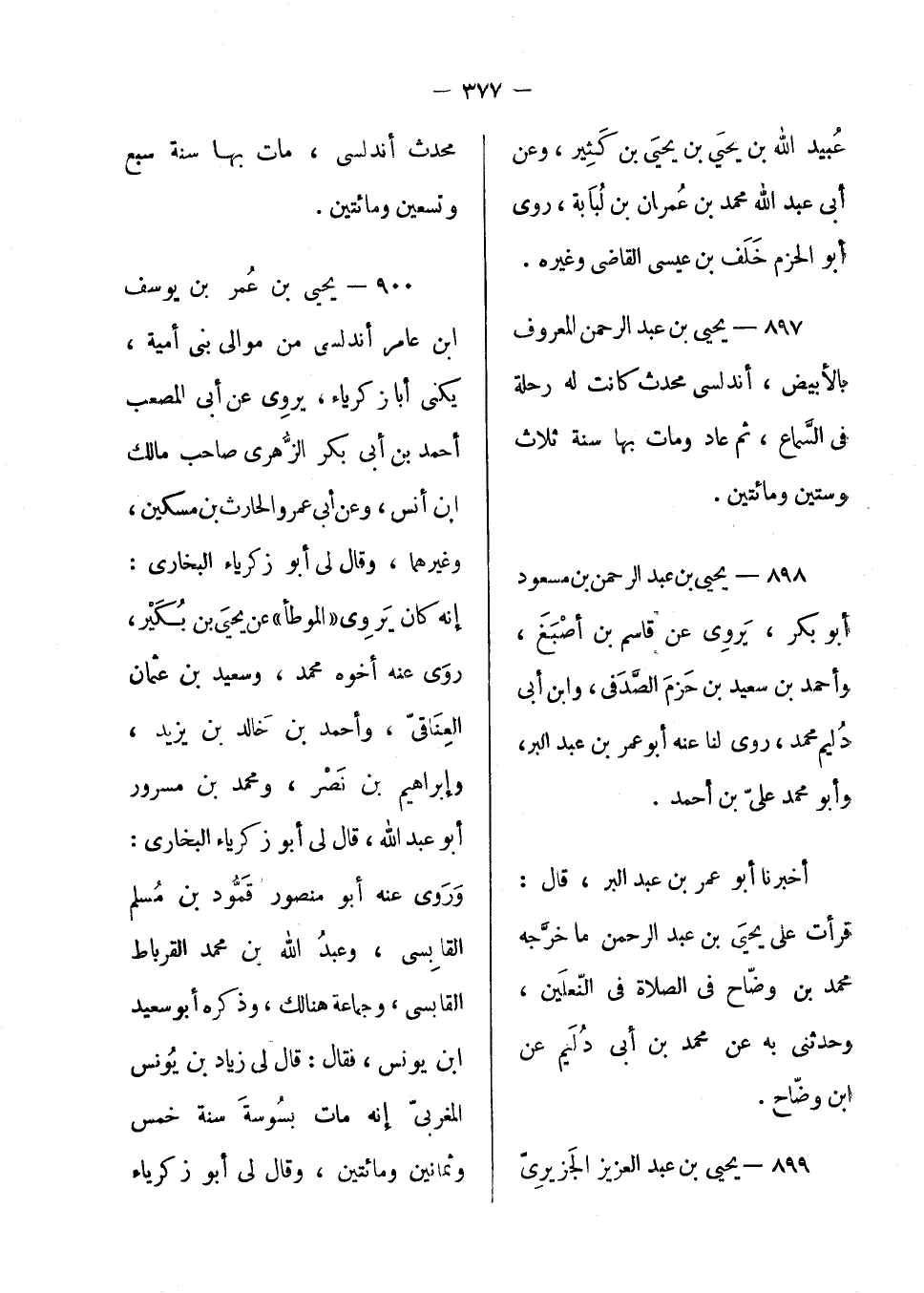 يحيى بن عمر بن يوسف بن عامر أندلسي من موالي بني أمية، يكنى أبا زكرياء، يروي عن أبي المصعب أحمد بن أبي بكر الزهري صاحب مالك بن أنس، وعن أبي عمرو الحارث بن سكين، وغيرهما، وقال لي أبو زكرياء البخاري: إنه كان يروي الموطأ عن يحيى بن بكير، روى عنه أخوه محمد، وسعيد بن عثمان العناقي، وأحمد بن خالد بن يزيد، وإبراهيم بن نصر، ومحمد بن مسرور أبو عبد؛ قال لي أبو زكرياء البخاري: وروى عنه أبو منصور قمود بن مسلم القابسي، وعبد الله بن محمد القرباطي القابسي، وجماعة هنالك، وذكره أبو سعيد بن يونس، فقال: قال لي زياد بن يونس المغربي إنه مات بسوسة سنة خمس وثمانين ومائتين، وقال لي أبو زكرياء