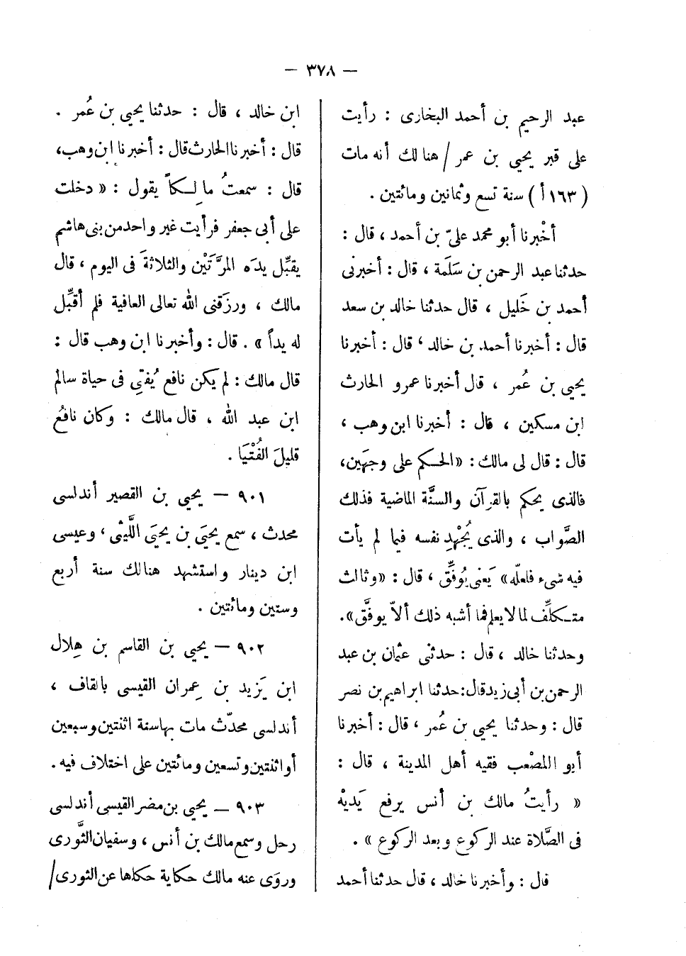 أخبرنا أبو محمد علي بن أحمد، قال: حدثنا عبد الرحمن بن سلمة، قال: أخبرني أحمد بن خليل، قال: حدثنا خالد بن سعد، قال: أخبرنا أحمد بن خالد، قال: أخبرنا يحيى بن عمر، قال: أخبرنا أبو عمرو الحارث بن مسكين، قال: أخبرنا ابن وهب، قال: قال لي مالك: الحكم على وجهين، فالذي يحكم بالقرآن والسنة الماضية فذلك الصواب، والذي يجهد نفسه فيما لم يأت فيه شئ فلعله يعني يوفق، قال: وثالث متكلف لما لا يعلم فما اشبه ذلك ألا يوفق. قال: وحدثنا خالد، قال: حدثني عثمان بن عبد الرحمن بن أبي زيد قال: حدثنا إبراهيم بن نصر، قال: حدثنا يحيى بن عمر، قال: أخبرنا أبوالمصعب ففيه أهل المدينة، قال: رأيت مالك بن أنس يرفع يديه في الصلاة عند الركوع وبعد الركوع ".