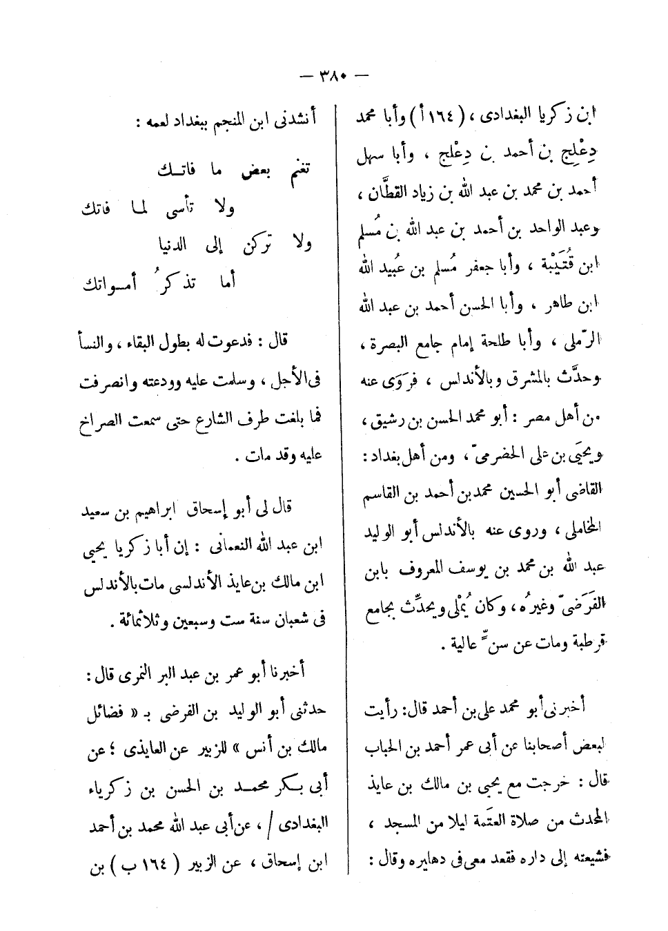 أخبرني أبو محمد علي بن أحمد قال: رأيت لبعض أصحابنا عن أبي عمر أحمد ابن الحباب قال: خرجت مع يحيى بن مالك بن عايذ المحدث من صلاة العتمة ليلاً من المسجد، فشيعته إلى داره فقعد معي في دهليزه وقال: أنشدني ابن المنجم ببغداد لعمه: