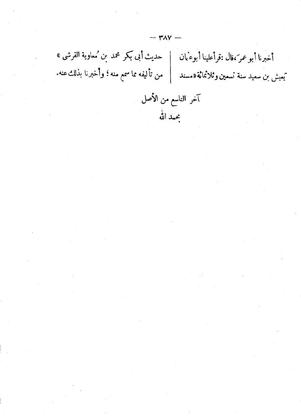 أخبرنا أبو عمر، قال: قرأ علينا أبو عثمان يعيش بن سعيد سنة تسعين وثلاث مائة مسند حديث أبي بكر محمد بن معاوية القرشي من تأليفه مما سمع منه، وأخبرنا بذلك عنه.