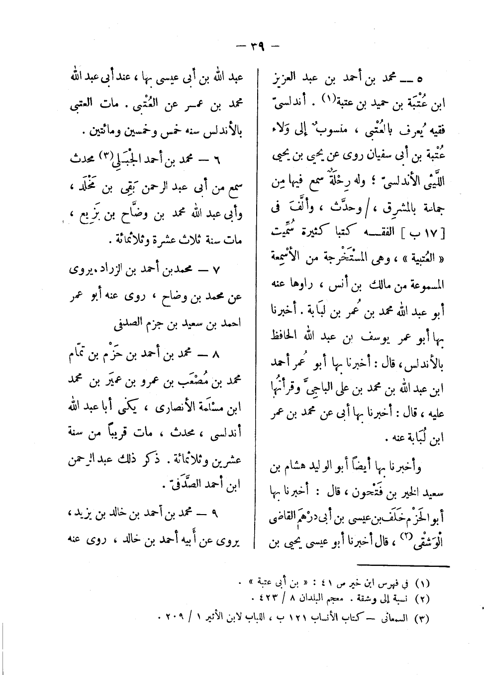 وأخبرنا بها أيضاً أبو الوليد هشام بن سعيد الخير بن فتحون، قال: أخبرنا بها أبو الحزم خلف بن عيسى بن أبي درهم القاضي الوشقي، قال: أخبرنا أبو عيسى يحيى بن عبد الله بن أبي عيسى بها، عند أبي عبد الله محمد بن عمر عن العتبي. مات العتبي بالأندلس سنة خمس وخمسين ومائتين.
