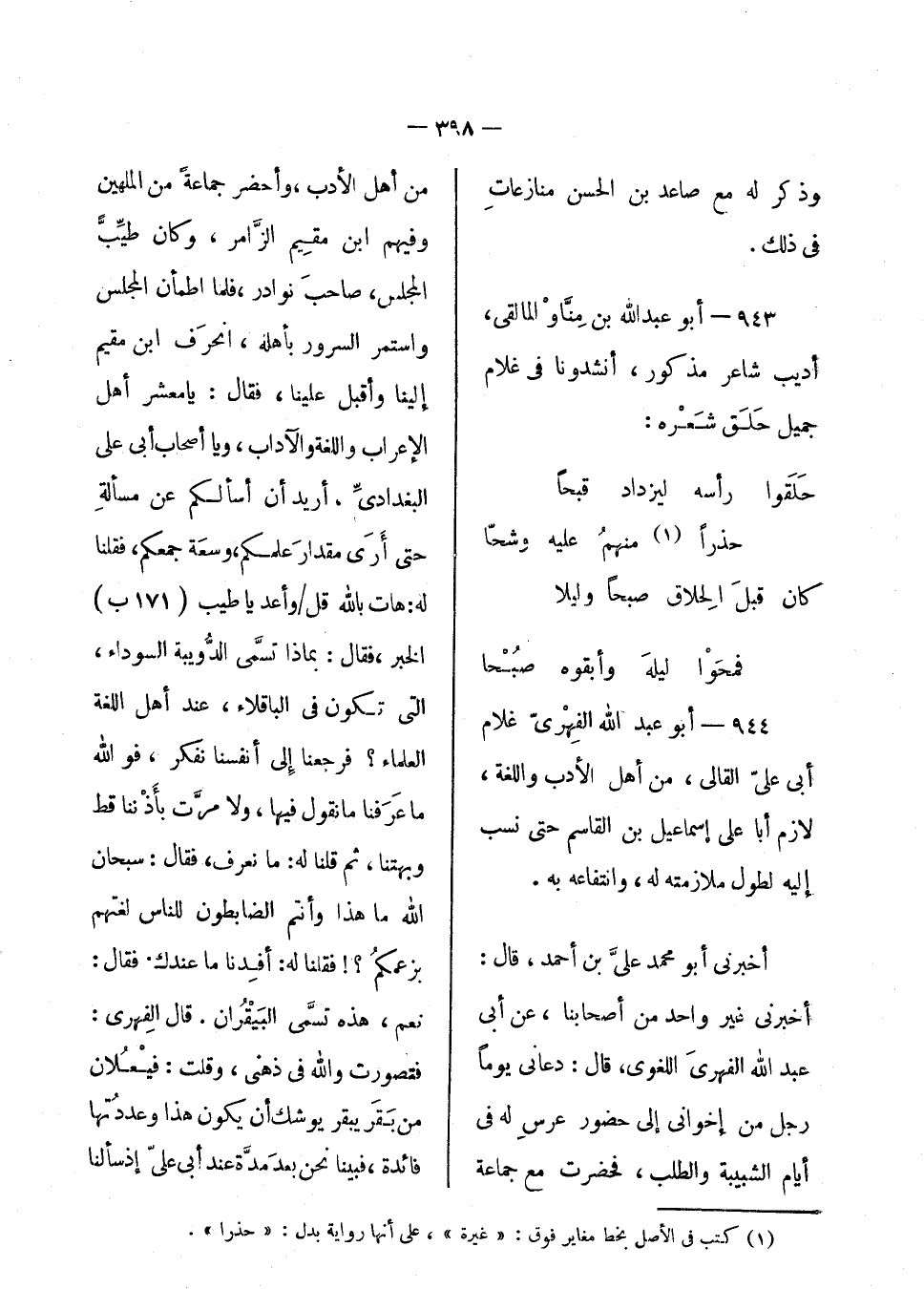 أخبرني أبو محمد علي بن أحمد، قال: أخبرني غير واحد من أصحابنا، عن أبي عبد الله الفهري اللغوي، قال: دعاني يوماً رجل من إخواني إلى حضور عرس له في أيام الشبيبة والطلب، فخضرت مع جماعة من أهل الأدب، وأحضر جماعة من الملهين وفيهم ابن مقيم الزامر، وكان طيب المجلس، صاحب نوادر، فلما اطمأن المجلس، واستمر السرور بأهله، انحرف ابن مقيم إلينا وأقبل علينا، فقال: يا معشر أهل الإعراب واللغة والآداب، ويأصحاب أبي علي البغدادي، أريد أن أسألكم عن مسألة حتى أرى مقدار علمكم. وسعة جمعكم، فقلنا له: هات بالله قل وأعد يا طيب الخبر، فقال: بماذا تسمى الدويبة السوداء، التي تكون في الباقلاء، عند أهل اللغة العلماء؟ فرجعنا إلى أنفسنا نفكر، فوالله ما عرفنا ما نقول فيها، ولا مرت بأذننا قط، وبهتنا، ثم قلنا له: ما نعرف. فقال: سبحان الله ما هذا وأنتم الضابطون للناس امتهم بزعمكم؟! فقلنا له: أفدنا ما عندك. فقال: نعم، هذه تسمى البيقران. قال الفهري: فتصورت والله في ذهني. وفلت: فيعلان من بقريبقر يوشك أن يكون هذا وعددتها فائدة، فبينا نحن بعد مدة عند أبي علي إذ سألنا