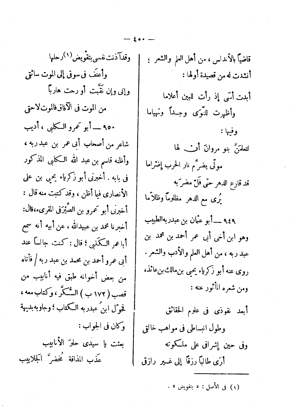 أبو عمر الكلبي، أديب شاعر من أصحاب أبي عمر بن عبد ربه، وأظنه قاسم بن عبد الله الكلبي المذكور في بابه. أخبرني أبو زكرياء يحيى بن علي الأنصاري فيما أظن، وقد كتبت منه قال: أخبرني أبو عمرو بن الصيرفي المقرئ، قال: أخبرنا محمد بن عبيد الله، عن أبيه أنه سمع أبا عمرو الكلبي، قال: كنت جالساً عند أبي عمر أحمد بن محمد بن عبد ربه فأتاه من بعض أخوانه طبق فيه أنابيب من قصب السكر، وكتاب معه، فحول ابن عبد ربه الكتاب، وجاوبه بهدية، وكان في الجواب: