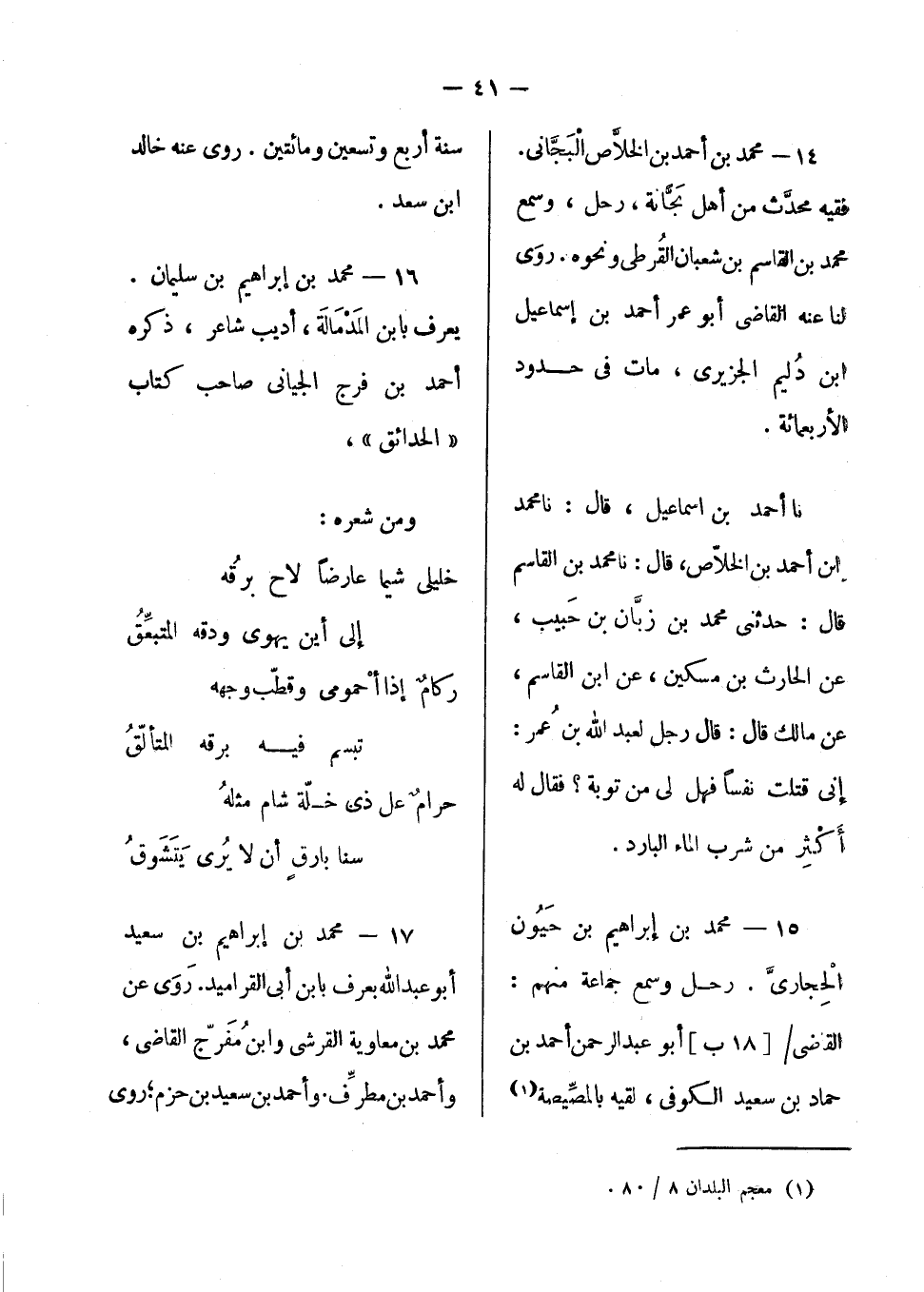 انا أحمد بن اسماعيل، قال: نا محمد بن أحمد بن الخلاص، قال: نا محمد بن القاسم قال: حدثني محمد بن زبان بن حبيب، عن الحارث بن مسكين، عن ابن القاسم، عن مالك قال: قال رجل لعبد الله بن عمر: إني قتلت نفساً فهل لي من توبة؟ فقال له: أكثر من شرب الماء البارد.