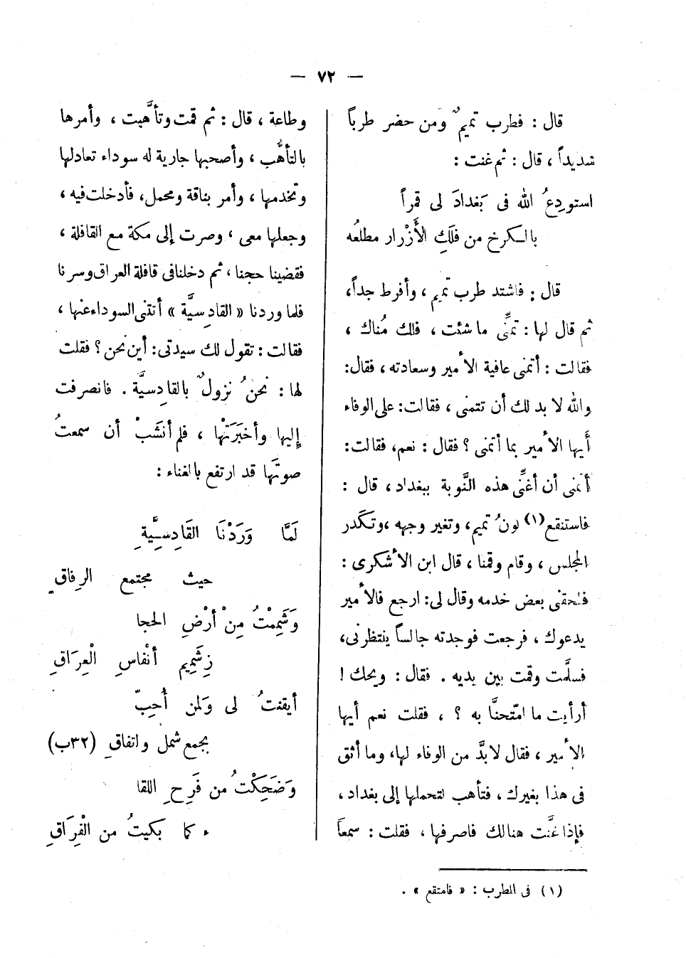 قال: فاشتد طرب تميم، وأفرط جداً، ثم قال لها: تمنى ما شئت، فلك مناك، فقالت: أتمنى عافية الأمير وسعادته، فقال: والله لابد لك أن تتمنى، فقالت: على الوفاء أيها الأمير بما أتمنى؟ فقال: نعم، فقالت: أتمنى أن أغني هذه النوبة ببغداذ، قال: فاستنقع لون تميم، وتغير وجهه، وتكدر المجلس، وقام وقمنا، قال ابن الأشكرى: فلحقني بعض خدمه وقال لي: ارجع، فالأمير يدعوك، فرجعت فوجدته جالساً ينتظرني، فسلمت وقمت بين يديه، فقال: ويحك! أرأيت ما امتحنا به؟، فقلت نعم أيها الأمير، فقال لابد من الوفاء لها، وما أثق في هذا بغيرك، فتأهب لتحملها إلى بغداذ، فإذا غنت هنالك فاصرفها، فقلت: سمعاً وطاعة، قال: ثم قمت وتأهبت، وأمرها بالتأهب، وأصحبها جارية له سوداء تعادلها وتخدمها، وأمر بناقة ومحمل، فأدخلت فيه، وجعلها معي، وصرت إلى مكة مع القافلة، فقضينا حجنا، ثم دخلنا في قافلة العراق وسرنا، فلما وردنا القادسية أتتنى السوداء عنها، فقالت: تقول لك سيدتي: أين نحن؟ فقلت لها: نحن نزول بالقادسية، فانصرفت إليها وأخبرتها، فلم أنشب أن سمعت صوتها قد ارتفع بالغناء: