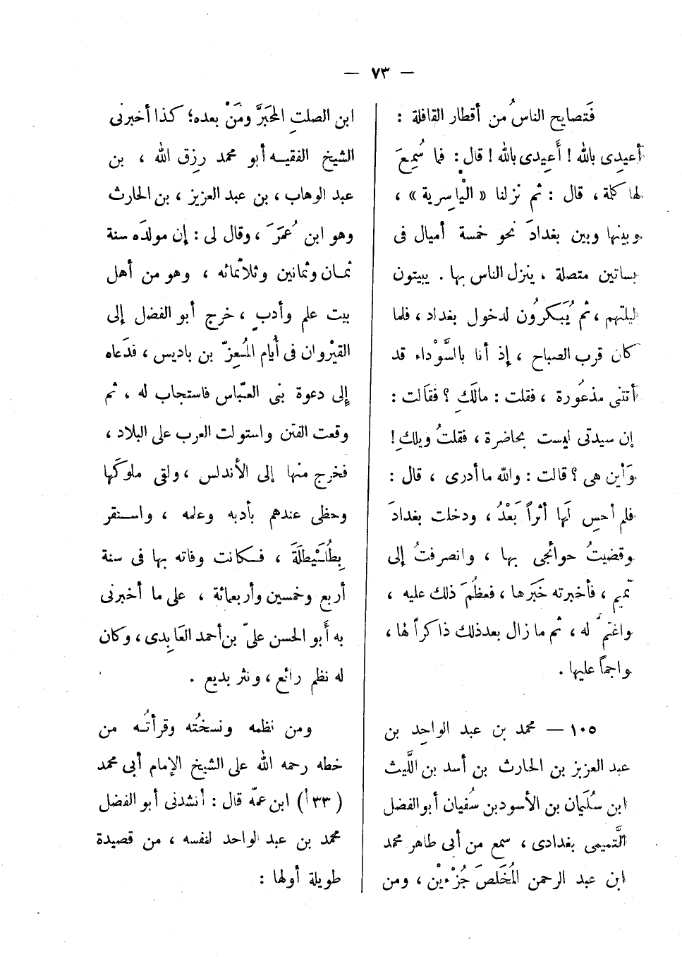 فتصايح الناس من أقطار القافلة: أعيدي بالله! أعيدي بالله! قال: فما سمع لها كلمة، قال: ثم نزلنا الياسرية، وبينها وبين بغداذ نحو خمسة أميال في بساتين متصلة، ينزل الناس بها. يبيتون ليلتهم، ثم يبكرون لدخول بغداذ، فلما كان قرب الصباح، إذ أنا بالسوداء قد أتتنى مذعورة، فقلت: مالك؟ فقالت: إن سيدتي ليست بحاضرة، فقلت ويلك! وأين هي؟ قالت: والله ما أدري، قال: فلم أحس لها أثراً بعد، ودخلت بغداذ وقضيت حوائجى بها، وانصرفت إلى تميم، فأخبرته خبرها، فعظم ذلك عليه، واغتم له، ثم ما زال بعد ذلك ذكراً لها، واجماً عليها.