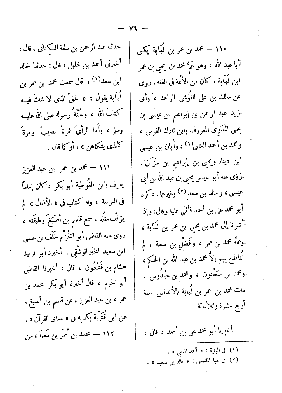 محمد بن عمر بن عبد العزيز يعرف بابن القوطية أبو بكر، كان إماماً في العربية، وله كتاب في الأفعال لم يؤلف مثله، سمع قاسم بن أصبغ وطبقته؛ روى عنه القاضي أبو الحزم خلف بن عيسى بن سعيد الخير الوشقي. أخبرنا أبو الوليد هشام ابن فتحون، قال: أخبرنا القاضي أبو الحزم، قال: أخبرنا أبو بكر محمد بن عمر، ابن عبد العزيز، عن قاسم بن أصبغ، عن ابن قتيبة بكتابه في معاني القرآن.