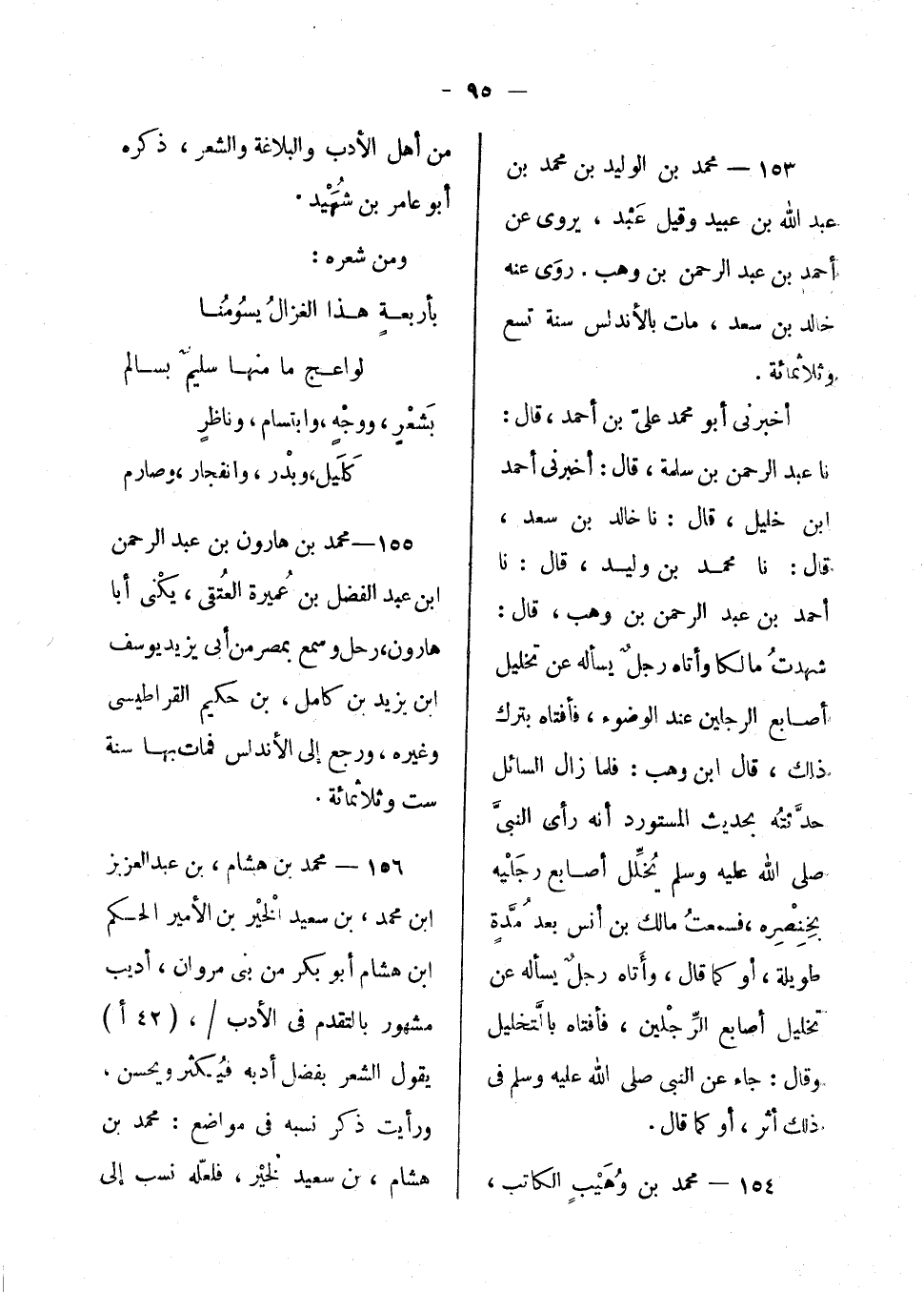 أخبرني أبو محمد علي بن أحمد، قال: نا عبد الرحمن بن سلمة، قال: أخبرني أحمد ابن خليل، قال: نا خالد بن سعد، قال: نا محمد بن وليد، قال: نا أحمد بن عبد الرحمن ابن وهب، قال: شهدت مالكا وأتاه رجل يسأله عن تخليل أصابع الرجلين عند الوضوء، فأفتاه بترك ذلك؛ قال ابن وهب: فلما زال السائل حدثته بحديث المستورد أنه رأى النبي صلى الله عليه وسلم يخلل أصابع رجليه بخنصره؛ فسمعت مالك بن أنس بعد مدة طويلة، أو كما قال، وأتاه رجل يسأله عن تخليل أصابع الرجلين، فأفتاه بالتخليل وقال: جاء عن النبي صلى الله عليه وسلم في ذلك أثر، أو كما قال.