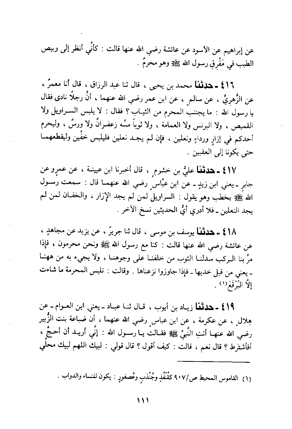 416 - حَدَّثَنَا مُحَمَّدُ بْنُ يَحْيَى، قَالَ: ثَنَا عَبْدُ الرَّزَّاقِ، قَالَ: أَنَا مَعْمَرٌ، عَنِ الزُّهْرِيِّ، عَنْ سَالِمٍ، عَنِ ابْنِ عُمَرَ، رَضِيَ اللَّهُ عَنْهُمَا أَنَّ رَجُلًا، نَادَى فَقَالَ: يَا رَسُولَ اللَّهِ مَا يَجْتَنِبُ الْمُحْرِمُ مِنَ الثِّيَابِ؟ فَقَالَ: «§لَا يَلْبَسُ السَّرَاوِيلَ، وَلَا الْقَمِيصَ، وَلَا البُرْنُسَ، وَلَا الْعِمَامَةَ، وَلَا ثَوْبًا مَسَّهُ زَعْفَرَانٌ، وَلَا وَرْسٌ، وَلْيُحْرِمْ أَحَدُكُمْ فِي إِزَارٍ، وَرِدَاءٍ، وَنَعْلَيْنِ، فَإِنْ لَمْ يَجِدْ نَعْلَيْنِ فَلْيَلْبَسْ خُفَّيْنِ، وَلْيَقْطَعْهُمَا حَتَّى يَكُونَا إِلَى الْعَقِبَيْنِ»