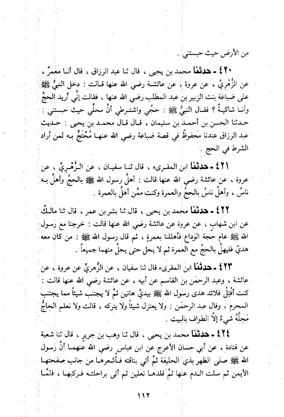 420 - حَدَّثَنَا مُحَمَّدُ بْنُ يَحْيَى، قَالَ: ثَنَا عَبْدُ الرَّزَّاقِ، قَالَ: أَنَا مَعْمَرٌ، عَنِ الزُّهْرِيِّ، عَنْ عُرْوَةَ، عَنْ عَائِشَةَ، رَضِيَ اللَّهُ عَنْهَا قَالَتْ: دَخَلَ النَّبِيُّ صَلَّى اللهُ عَلَيْهِ وَسَلَّمَ عَلَى ضُبَاعَةَ بِنْتِ الزُّبَيْرِ بْنِ عَبْدِ الْمُطَّلِبِ رَضِيَ اللَّهُ عَنْهَا فَقَالَتْ: إِنِّي أُرِيدُ الْحَجَّ وَأَنَا شَاكِيَةٌ فَقَالَ النَّبِيُّ صَلَّى اللهُ عَلَيْهِ وَسَلَّمَ: «§حُجِّي وَاشْتَرِطِي أَنَّ مَحِلِّي حَيْثُ حَبَسْتَنِي» حَدَّثَنَا الْحَسَنُ بْنُ أَحْمَدَ بْنِ سُلَيْمَانَ قَالَ: قَالَ مُحَمَّدُ بْنُ يَحْيَى: حَدِيثُ عَبْدِ الرَّزَّاقِ عِنْدَنَا مَحْفُوظٌ فِي قِصَّةِ ضُبَاعَةَ رَضِيَ اللَّهُ عَنْهَا، مُحْتَجٌّ بِهِ لِمَنْ أَرَادَ الشَّرْطَ فِي الْحَجِّ