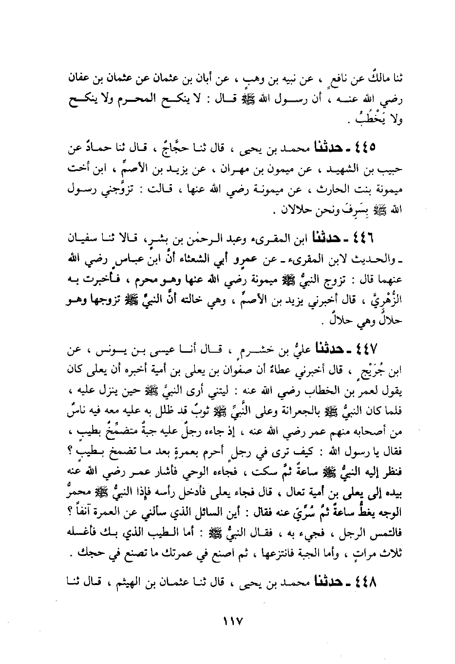 446 - حَدَّثَنَا ابْنُ الْمُقْرِئِ، وَعَبْدُ الرَّحْمَنِ بْنُ بِشْرٍ، قَالَا: ثَنَا سُفْيَانُ، وَالْحَدِيثُ لِابْنِ الْمُقْرِئِ عَنْ عَمْرٍو أَبِي الشَّعْثَاءِ، أَنَّ ابْنَ عَبَّاسٍ، رَضِيَ اللَّهُ عَنْهُمَا قَالَ: «§تَزَوَّجَ النَّبِيُّ صَلَّى اللهُ عَلَيْهِ وَسَلَّمَ مَيْمُونَةَ رَضِيَ اللَّهُ عَنْهَا وَهُوَ مُحْرِمٌ» فَأَخْبَرْتُ بِهِ الزُّهْرِيَّ قَالَ: أَخْبَرَنِي يَزِيدُ بْنُ الْأَصَمِّ وَهِيَ خَالَتُهُ أَنَّ النَّبِيَّ صَلَّى اللهُ عَلَيْهِ وَسَلَّمَ تَزَوَّجَهَا وَهُوَ حَلَالٌ وَهِيَ حَلَالٌ