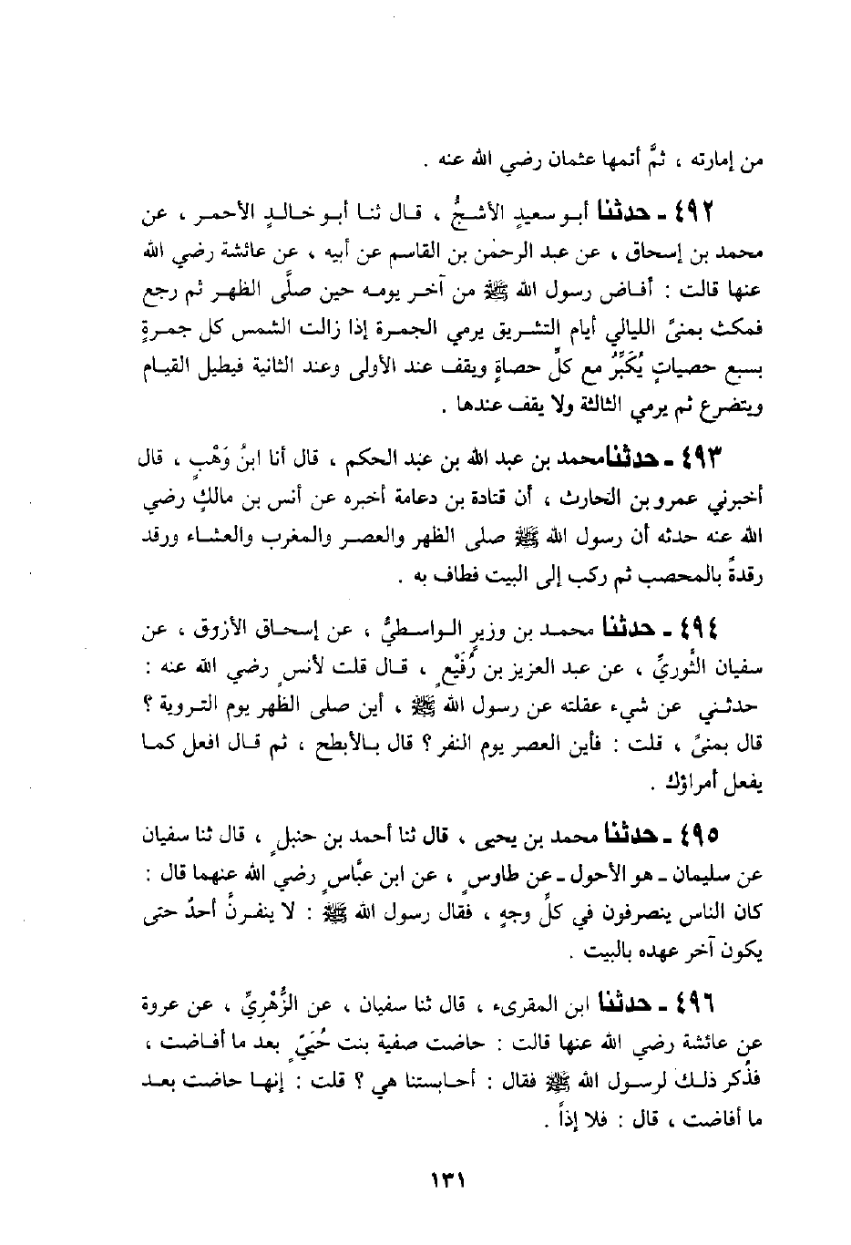 494 - حَدَّثَنَا مُحَمَّدُ بْنُ وَزِيرٍ الْوَاسِطِيُّ، عَنْ إِسْحَاقَ الْأَزْرَقِ، عَنْ سُفْيَانَ الثَّوْرِيِّ، عَنْ عَبْدِ الْعَزِيزِ بْنِ رُفَيْعٍ، قَالَ: قُلْتُ لِأَنَسٍ رَضِيَ اللَّهُ عَنْهُ: حَدِّثْنِي عَنْ شَيْءٍ عَقَلْتَهُ عَنْ رَسُولِ اللَّهِ صَلَّى اللهُ عَلَيْهِ وَسَلَّمَ §أَيْنَ صَلَّى الظُّهْرَ يَوْمَ التَّرْوِيَةِ؟ قَالَ: بِمِنًى قُلْتُ: فَأَيْنَ الْعَصْرَ يَوْمَ النَّفْرِ؟ قَالَ: بِالْأَبْطَحِ ثُمَّ قَالَ: افْعَلْ كَمَا يَفْعَلُ أُمَرَاؤُكَ