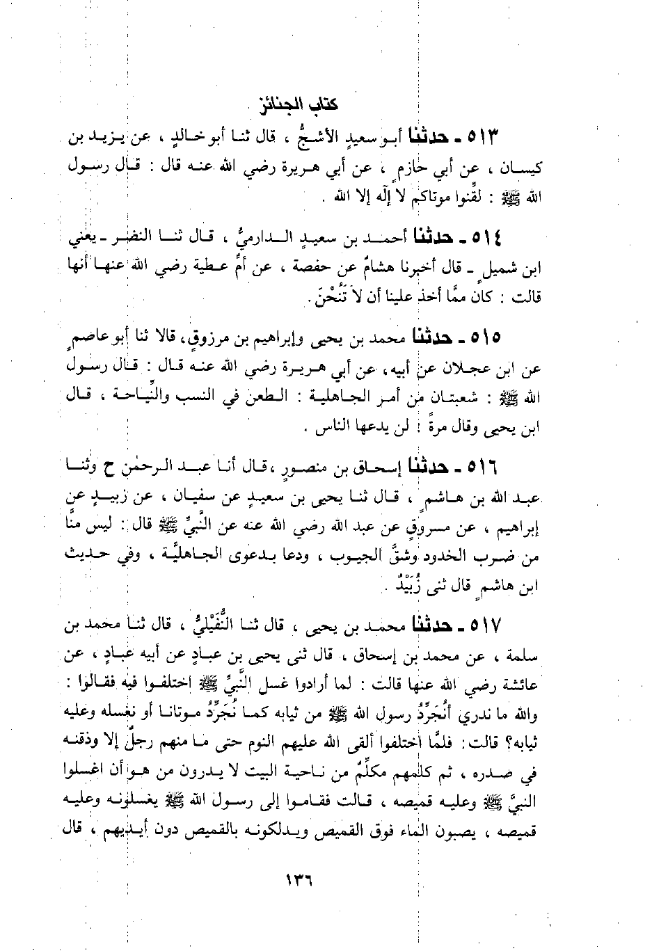 517 - حَدَّثَنَا مُحَمَّدُ بْنُ يَحْيَى، قَالَ: ثَنَا النُّفَيْلِيُّ، قَالَ: ثَنَا مُحَمَّدُ بْنُ سَلَمَةَ، عَنْ مُحَمَّدِ بْنِ إِسْحَاقَ، قَالَ: ثَنِي يَحْيَى بْنُ عَبَّادٍ، عَنْ أَبِيهِ عَبَّادٍ، عَنْ عَائِشَةَ، رَضِيَ اللَّهُ عَنْهَا قَالَتْ: §لَمَّا أَرَادُوا غُسْلَ النَّبِيِّ صَلَّى اللهُ عَلَيْهِ وَسَلَّمَ اخْتَلَفُوا فِيهِ فَقَالُوا: وَاللَّهِ مَا نَدْرِي أَنُجَرِّدُ رَسُولَ اللَّهِ صَلَّى اللهُ عَلَيْهِ وَسَلَّمَ مِنْ ثِيَابِهِ كَمَا نُجَرِّدُ مَوْتَانَا أَوْ نَغْسِلُهُ وَعَلَيْهِ ثِيَابُهُ؟ قَالَتْ: فَلَمَّا اخْتَلَفُوا أَلْقَى اللَّهُ عَلَيْهِمُ النَّوْمَ حَتَّى مَا مِنْهُمْ رَجُلٌ إِلَّا وَذَقْنُهُ فِي صَدْرِهِ ثُمَّ كَلَّمَهُمْ مُكَلَّمٌ مِنْ نَاحِيَةِ الْبَيْتِ لَا يَدْرُونَ مَنْ هُوَ أَنِ اغْسِلُوا النَّبِيَّ صَلَّى اللهُ عَلَيْهِ وَسَلَّمَ، وَعَلَيْهِ قَمِيصُهُ قَالَتْ: فَقَامُوا إِلَى رَسُولِ اللَّهِ صَلَّى اللهُ عَلَيْهِ وَسَلَّمَ يَغْسِلُونَهُ وَعَلَيْهِ قَمِيصُهُ يَصُبُّونَ الْمَاءَ فَوْقَ الْقَمِيصِ وَيُدَلِّكُونَهُ بِالْقَمِيصِ دُونَ أَيْدِيهِمْ، قَالَ: وَكَانَتْ عَائِشَةُ رَضِيَ اللَّهُ عَنْهَا تَقُولُ: لَوِ اسْتَقْبَلْتُ مِنْ أَمْرِي مَا اسْتَدْبَرْتُ مَا غَسَلَهُ إِلَّا نِسَاؤُهُ، فَلَمَّا فُرِغَ مِنْ غُسْلِ رَسُولِ اللَّهِ صَلَّى اللهُ عَلَيْهِ وَسَلَّمَ كُفِّنَ فِي ثَلَاثَةِ أَثْوَابٍ صَحَارِيِّينَ وَبُرْدِ حَبَرَةٍ أُدْرِجَ فِيهِنَّ إِدْرَاجًا " كَمَا حَدَّثَنِي جَعْفَرُ بْنُ مُحَمَّدٍ، عَنْ أَبِيهِ، عَنْ جَدِّهِ عَلِيِّ بْنِ الْحُسَيْنِ، وَالزُّهْرِيُّ، عَنْ عَلِيِّ بْنِ حُسَيْنٍ رَضِيَ اللَّهُ عَنْهُمْ