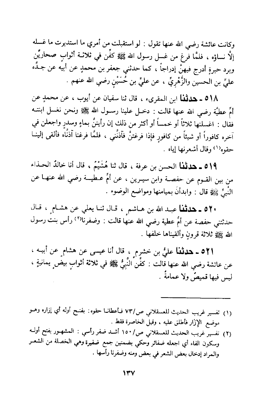 521 - حَدَّثَنَا عَلِيُّ بْنُ خَشْرَمٍ، قَالَ: أَنَا عِيسَى، عَنْ هِشَامٍ، عَنْ أَبِيهِ، عَنْ عَائِشَةَ، رَضِيَ اللَّهُ عَنْهَا قَالَتْ: «§كُفِّنَ النَّبِيُّ صَلَّى اللهُ عَلَيْهِ وَسَلَّمَ فِي ثَلَاثَةِ أَثْوَابٍ يَمَانِيَةٍ لَيْسَ فِيهَا قَمِيصٌ وَلَا عِمَامَةٌ»