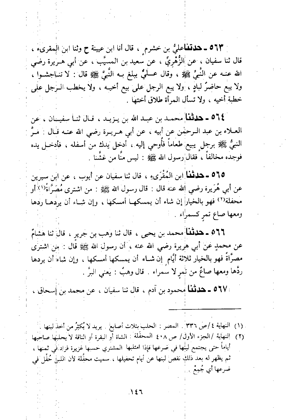 563 - حَدَّثَنَا عَلِيُّ بْنُ خَشْرَمٍ، قَالَ: أَنَا ابْنُ عُيَيْنَةَ، ح وَثَنَا ابْنُ الْمُقْرِئِ، قَالَ: ثَنَا سُفْيَانُ، عَنِ الزُّهْرِيِّ، عَنْ سَعِيدِ بْنِ الْمُسَيِّبِ، عَنْ أَبِي هُرَيْرَةَ، رَضِيَ اللَّهُ عَنْهُ، عَنِ النَّبِيِّ صَلَّى اللهُ عَلَيْهِ وَسَلَّمَ وَقَالَ عَلِيُّ: يَبْلُغُ بِهِ النَّبِيَّ صَلَّى اللهُ عَلَيْهِ وَسَلَّمَ قَالَ: «§لَا تَنَاجَشُوا وَلَا يَبِعْ حَاضِرٌ لِبَادٍ وَلَا يَبِعِ الرَّجُلُ عَلَى بَيْعِ أَخِيهِ وَلَا يَخْطُبِ الرَّجُلُ عَلَى خِطْبَةِ أَخِيهِ وَلَا تَسْأَلِ الْمَرْأَةُ طَلَاقَ أُخْتِهَا»