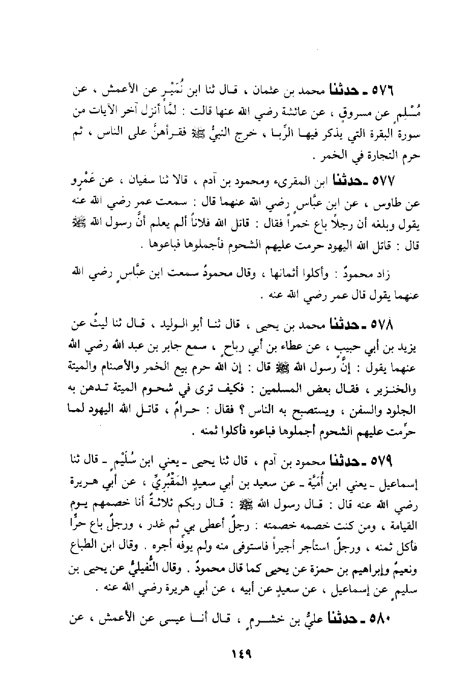 577 - حَدَّثَنَا ابْنُ الْمُقْرِئِ، وَمَحْمُودُ بْنُ آدَمَ، قَالَا: ثَنَا سُفْيَانُ، عَنْ عَمْرٍو، عَنْ طَاوُسٍ، عَنِ ابْنِ عَبَّاسٍ، رَضِيَ اللَّهُ عَنْهُمَا قَالَ: سَمِعْتُ عُمَرَ، رَضِيَ اللَّهُ عَنْهُ يَقُولُ وَبَلَغَهُ أَنَّ رَجُلًا بَاعَ خَمْرًا فَقَالَ: قَاتَلَ اللَّهُ فُلَانًا أَلَمْ يَعْلَمْ أَنَّ رَسُولَ اللَّهِ صَلَّى اللهُ عَلَيْهِ وَسَلَّمَ قَالَ: «§قَاتَلَ اللَّهُ الْيَهُودَ حُرِّمَتْ عَلَيْهِمُ الشُّحُومُ فَأَجْمَلُوهَا فَبَاعُوهَا» زَادَ مَحْمُودُ وَأَكَلُوا أَثْمَانَهَا وَقَالَ مَحْمُودُ سَمِعْتُ ابْنَ عَبَّاسٍ رَضِيَ اللَّهُ عَنْهُمَا يَقُولُ: قَالَ عُمَرُ رَضِيَ اللَّهُ عَنْهُ