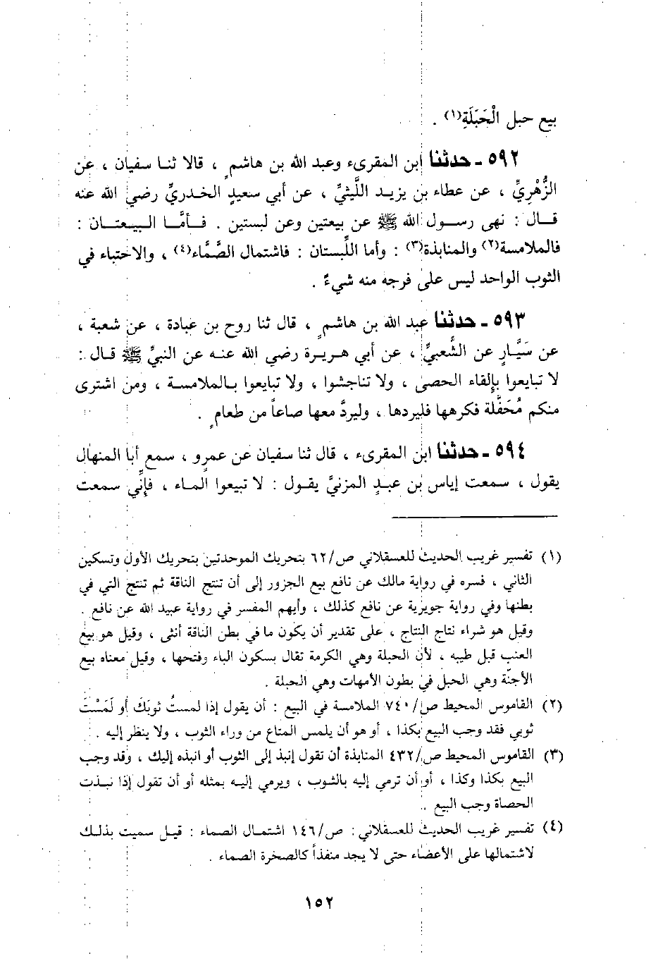 592 - حَدَّثَنَا ابْنُ الْمُقْرِئِ، وَعَبْدُ اللَّهِ بْنُ هَاشِمٍ، قَالَا: ثنا سُفْيَانُ، عَنِ الزُّهْرِيِّ، عَنْ عَطَاءِ بْنِ يَزِيدَ اللَّيْثِيِّ، عَنْ أَبِي سَعِيدٍ الْخُدْرِيِّ، رَضِيَ اللَّهُ عَنْهُ قَالَ: «§نَهَى رَسُولُ اللَّهِ صَلَّى اللهُ عَلَيْهِ وَسَلَّمَ عَنْ بَيْعَتَيْنِ وَعَنْ لِبْسَتَيْنِ، فَأَمَّا الْبَيْعَتَانِ فَالْمُلَامَسَةُ وَالْمُنَابَذَةُ، وَأَمَّا اللِّبْسَتَانِ فَاشْتِمَالُ الصَّمَّاءِ وَالِاحْتِبَاءُ فِي الثَّوْبِ الْوَاحِدِ لَيْسَ عَلَى فَرْجِهِ مِنْهُ شَيْءٌ»