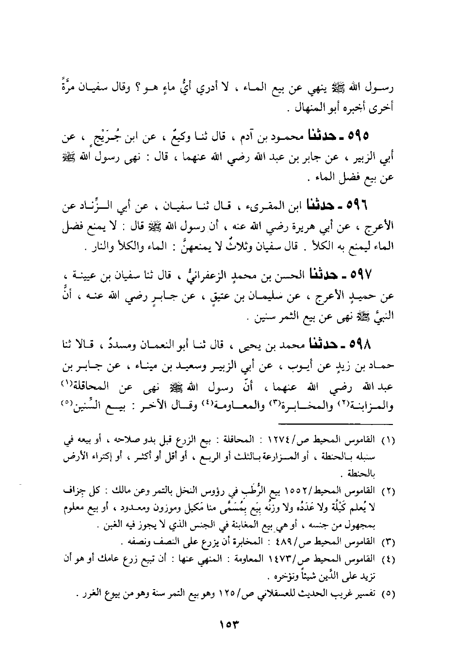 596 - حَدَّثَنَا ابْنُ الْمُقْرِئِ، قَالَ: ثنا سُفْيَانُ، عَنْ أَبِي الزِّنَادِ، عَنِ الْأَعْرَجِ، عَنْ أَبِي هُرَيْرَةَ، رَضِيَ اللَّهُ عَنْهُ أَنَّ رَسُولَ اللَّهِ صَلَّى اللهُ عَلَيْهِ وَسَلَّمَ قَالَ: «§لَا يُمْنَعُ فَضْلُ الْمَاءِ لِيُمْنَعَ بِهِ الْكَلَأُ» قَالَ سُفْيَانُ: وَثَلَاثٌ لَا يُمْنَعُهُنَّ: الْمَاءُ وَالْكَلَأُ وَالنَّارُ