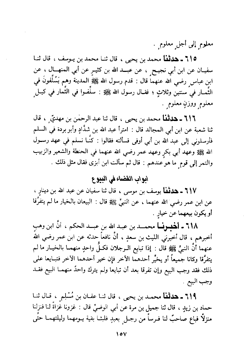 617 - حَدَّثَنَا يُوسُفُ بْنُ مُوسَى، قَالَ: ثنا سُفْيَانُ، عَنْ عَبْدِ اللَّهِ بْنِ دِينَارٍ، عَنِ ابْنِ عُمَرَ، رَضِيَ اللَّهُ عَنْهُمَا، عَنِ النَّبِيِّ صَلَّى اللهُ عَلَيْهِ وَسَلَّمَ قَالَ: «§الْبَيِّعَانِ بِالْخِيَارِ مَا لَمْ يَتَفَرَّقَا أَوْ يَكُونُ بَيْعُهُمَا عَنْ خِيَارٍ»