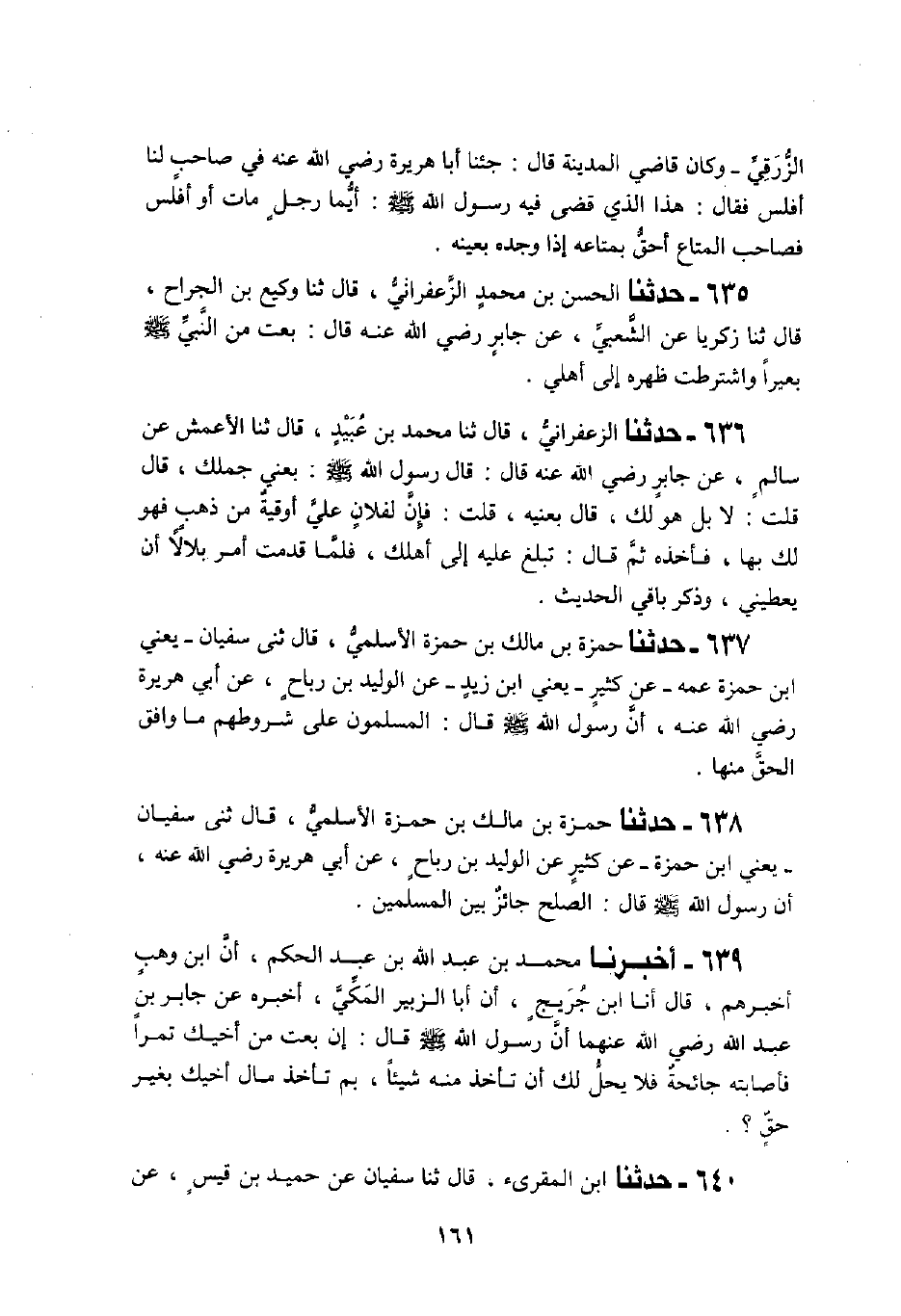 638 - حَدَّثَنَا حَمْزَةُ بْنُ مَالِكِ بْنِ حَمْزَةَ الْأَسْلَمِيُّ، قَالَ: ثني سُفْيَانُ يَعْنِي ابْنَ حَمْزَةَ، عَنْ كَثِيرٍ، عَنِ الْوَلِيدِ بْنِ رَبَاحٍ، عَنْ أَبِي هُرَيْرَةَ، رَضِيَ اللَّهُ عَنْهُ أَنَّ رَسُولَ اللَّهِ صَلَّى اللهُ عَلَيْهِ وَسَلَّمَ قَالَ: «§الصُّلْحُ جَائِزٌ بَيْنَ الْمُسْلِمِينَ»