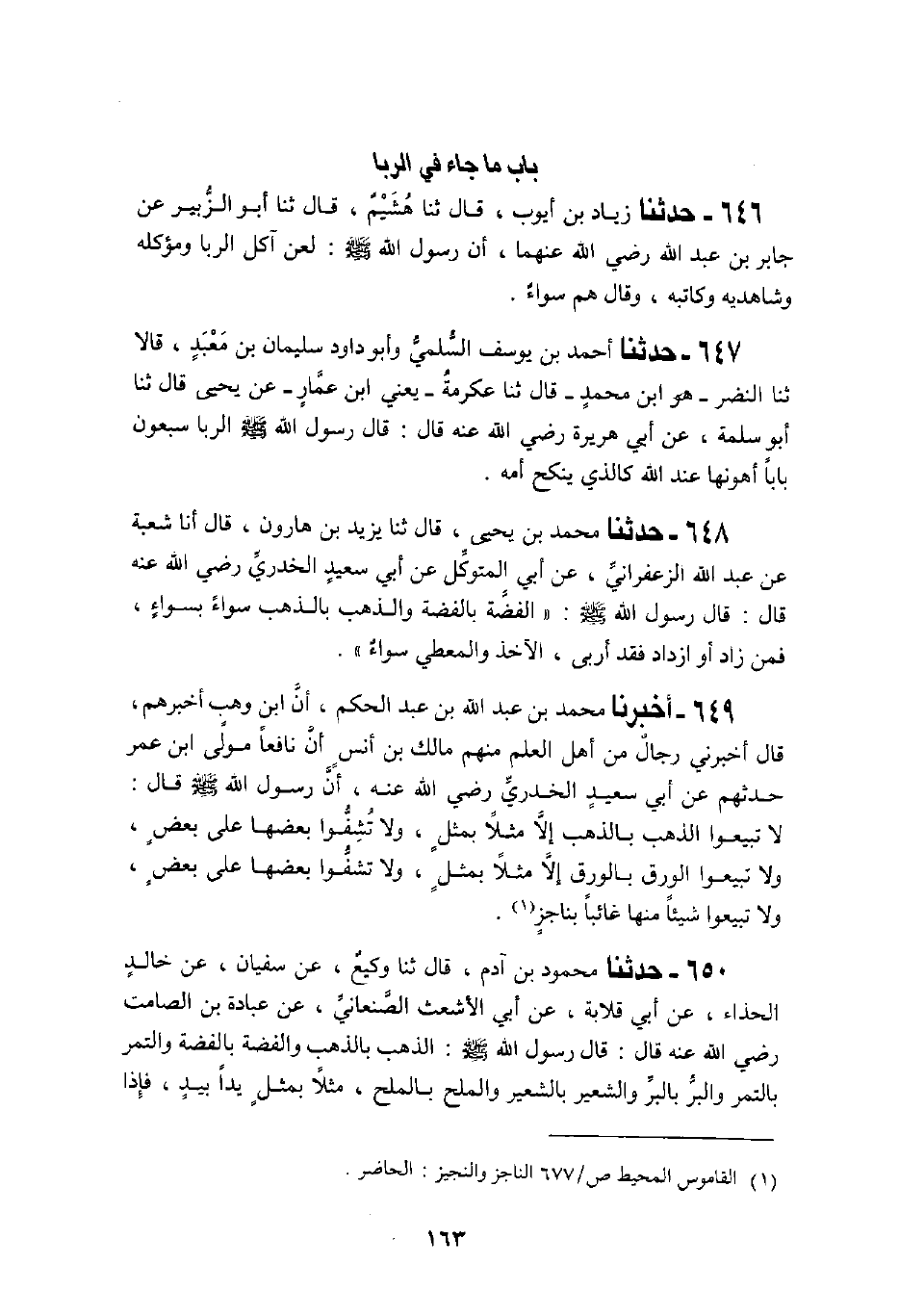 646 - حَدَّثَنَا زِيَادُ بْنُ أَيُّوبَ، قَالَ: ثنا هُشَيْمٌ، قَالَ: ثنا أَبُو الزُّبَيْرِ، عَنْ جَابِرِ بْنِ عَبْدِ اللَّهِ، رَضِيَ اللَّهُ عَنْهُمَا «أَنَّ رَسُولَ اللَّهِ صَلَّى اللهُ عَلَيْهِ وَسَلَّمَ §لَعَنْ آكِلَ الرِّبَا وَمُؤْكِلَهُ وَشَاهِدَيْهَ وَكَاتِبَهُ» وَقَالَ: «هُمْ سَوَاءٌ»