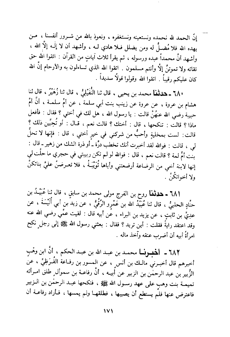 680 - حَدَّثَنَا مُحَمَّدُ بْنُ يَحْيَى، قَالَ: ثنا النُّفَيْلِيُّ، قَالَ: ثنا زُهَيْرٌ، قَالَ: ثنا هِشَامُ بْنُ عُرْوَةَ، عَنْ عُرْوَةَ، عَنْ زَيْنَبَ بِنْتِ أَبِي سَلَمَةَ، عَنْ أُمِّ سَلَمَةَ، أَنَّ أُمَّ حَبِيبَةَ رَضِيَ اللَّهُ عَنْهُنَّ، قَالَتْ: يَا رَسُولَ اللَّهِ هَلْ لَكَ فِي أُخْتِي فَقَالَ: «فَأَفْعَلُ مَاذَا؟» ، قَالَتْ: تَنْكِحُهَا، قَالَ: «أُخْتَكِ؟» ، قَالَتْ: نَعَمْ، قَالَ: «أَوَتُحِبِّينَ ذَلِكَ؟» ، قَالَتْ: لَسْتُ بِمُخْلِيَةٍ وَأَحَبُّ مَنْ شَرِكَنِي فِي خَيْرٍ أُخْتِي قَالَ: «فَإِنَّهَا لَا تَحِلُّ لِي» ، قَالَتْ: فَوَاللَّهِ لَقَدْ أُخْبِرْتُ أَنَّكَ تَخْطُبُ دُرَّةَ أَوْ ذَرَّةَ الشَّكُّ مِنْ زُهَيْرٍ قَالَ: «بِنْتُ أُمِّ سَلَمَةَ؟» قَالَتْ: نَعَمْ قَالَ: «فَوَاللَّهِ §لَوْ لَمْ تَكُنْ رَبِيبَتِي فِي حِجْرِي مَا حَلَّتْ لِي إِنَّهَا لَابْنَةُ أَخِي مِنَ الرَّضَاعَةِ أَرْضَعَتْنِي وَأَبَاهَا ثُوَيْبَةُ فَلَا تَعْرِضَنَّ عَلَيَّ بَنَاتِكُنَّ وَلَا أَخَوَاتِكُنَّ»