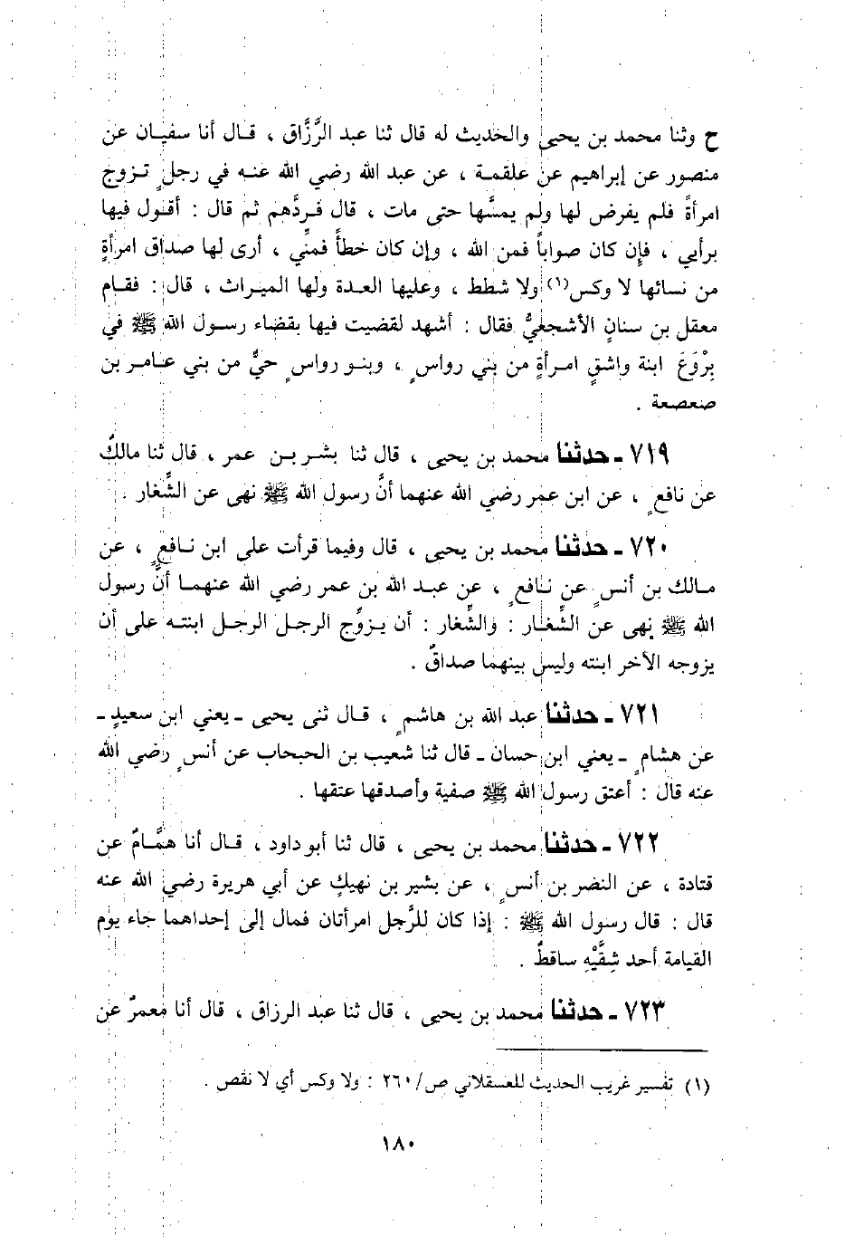 720 - حَدَّثَنَا مُحَمَّدُ بْنُ يَحْيَى، قَالَ: وَفِيمَا قَرَأْتُ عَلَى ابْنِ نَافِعٍ، عَنْ مَالِكِ بْنِ أَنَسٍ، عَنْ نَافِعٍ، عَنْ عَبْدِ اللَّهِ بْنِ عُمَرَ، رَضِيَ اللَّهُ عَنْهُمَا أَنَّ رَسُولَ اللَّهِ صَلَّى اللهُ عَلَيْهِ وَسَلَّمَ «§نَهَى عَنِ الشِّغَارِ» ، وَالشِّغَارُ: أَنْ يُزَوِّجَ الرَّجُلُ الرَّجُلَ ابْنَتَهُ عَلَى أَنْ يُزَوِّجَهُ الْآخَرُ ابْنَتَهُ وَلَيْسَ بَيْنَهُمَا صَدَاقٌ