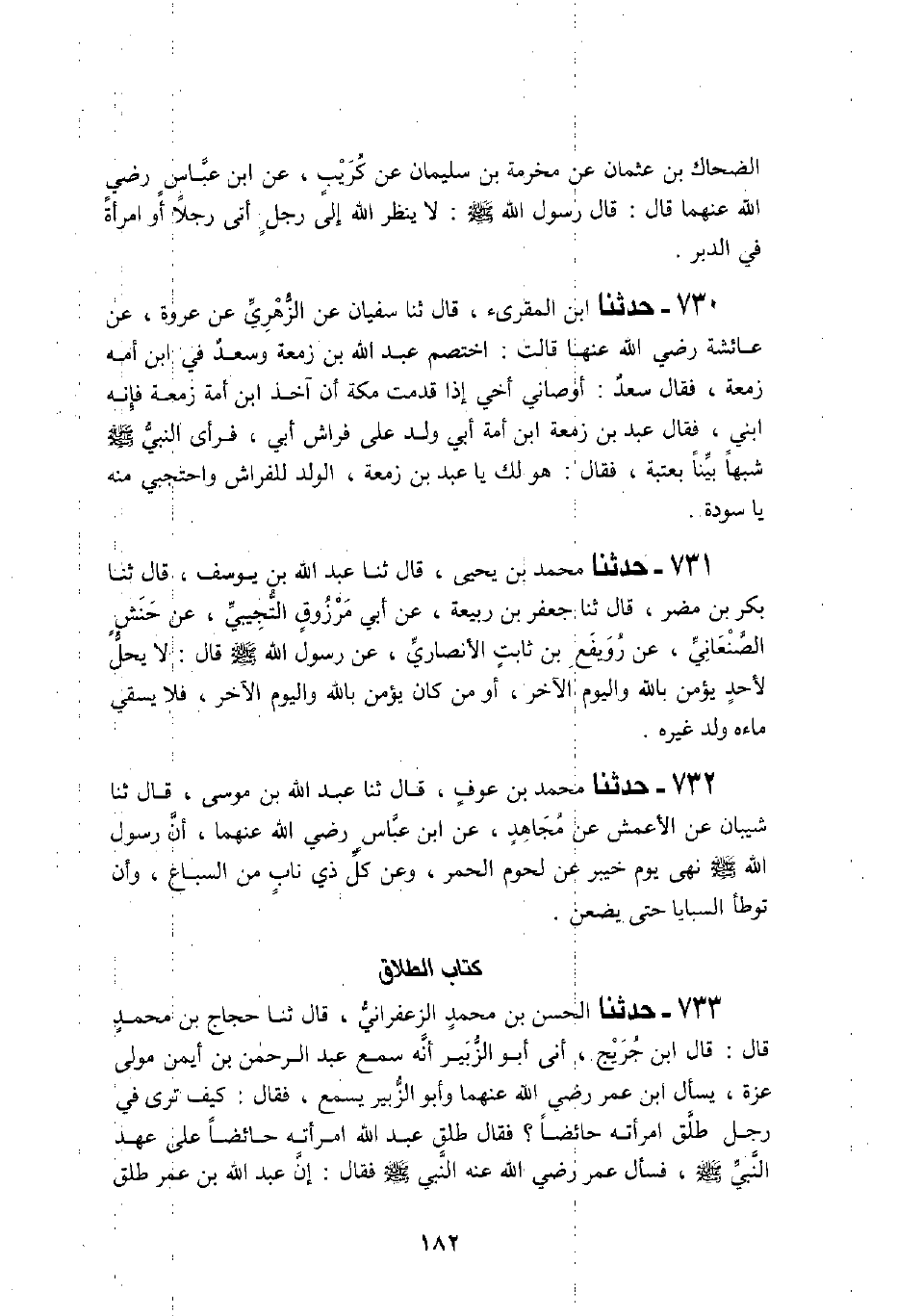 730 - حَدَّثَنَا ابْنُ الْمُقْرِئِ، قَالَ: ثنا سُفْيَانُ، عَنِ الزُّهْرِيِّ، عَنْ عُرْوَةَ، عَنْ عَائِشَةَ، رَضِيَ اللَّهُ عَنْهُ قَالَتِ: اخْتَصَمَ عَبْدُ اللَّهِ بْنُ زَمْعَةَ، وَسَعْدٌ فِي ابْنِ أَمَةِ زَمْعَةَ، فَقَالَ سَعْدٌ: أَوْصَانِي أَخِي إِذَا قَدِمْتُ مَكَّةَ أَنْ آخُذَ ابْنَ أَمَةِ زَمْعَةَ فَإِنَّهُ ابْنِي، فَقَالَ عَبْدُ بْنُ زَمْعَةَ ابْنِ أَمَةِ أَبِي، وُلِدَ عَلَى فِرَاشِ أَبِي فَرَأَى النَّبِيُّ صَلَّى اللهُ عَلَيْهِ وَسَلَّمَ شَبَهًا بَيِّنًا بِعُتْبَةَ، فَقَالَ: «هُوَ لَكَ يَا عَبْدُ بْنُ زَمْعَةَ §الْوَلَدُ لِلْفِرَاشِ، وَاحْتَجِبِي مِنْهُ يَا سَوْدَةُ»
