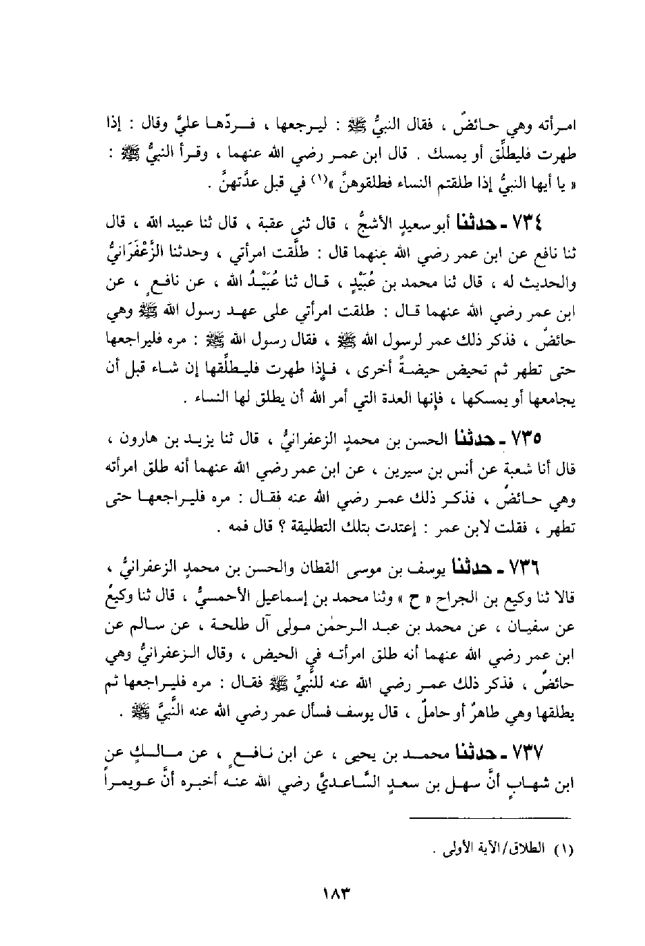 736 - حَدَّثَنَا يُوسُفُ بْنُ مُوسَى الْقَطَّانُ، وَالْحَسَنُ بْنُ مُحَمَّدٍ الزَّعْفَرَانِيُّ، قَالَا: ثنا وَكِيعُ بْنُ الْجَرَّاحِ، ح وَثَنَا مُحَمَّدُ بْنُ إِسْمَاعِيلَ الْأَحْمَسِيُّ، قَالَ: ثنا وَكِيعٌ، عَنْ سُفْيَانَ، عَنْ مُحَمَّدِ بْنِ عَبْدِ الرَّحْمَنِ، مَوْلَى آلِ طَلْحَةَ، عَنْ سَالِمٍ، عَنِ ابْنِ عُمَرَ، رَضِيَ اللَّهُ عَنْهُمَا أَنَّهُ طَلَّقَ امْرَأَتَهُ فِي الْحَيْضِ، وَقَالَ الزَّعْفَرَانِيُّ: وَهِيَ حَائِضٌ، فَذَكَرَ ذَلِكَ عُمَرُ رَضِيَ اللَّهُ عَنْهُ لِلنَّبِيِّ صَلَّى اللهُ عَلَيْهِ وَسَلَّمَ فَقَالَ: «§مُرْهُ فَلْيُرَاجِعْهَا ثُمَّ يُطَلِّقُهَا وَهِيَ طَاهِرٌ أَوْ حَامِلٌ» قَالَ يُوسُفُ: فَسَأَلَ عُمَرُ رَضِيَ اللَّهُ عَنْهُ النَّبِيَّ صَلَّى اللهُ عَلَيْهِ وَسَلَّمَ