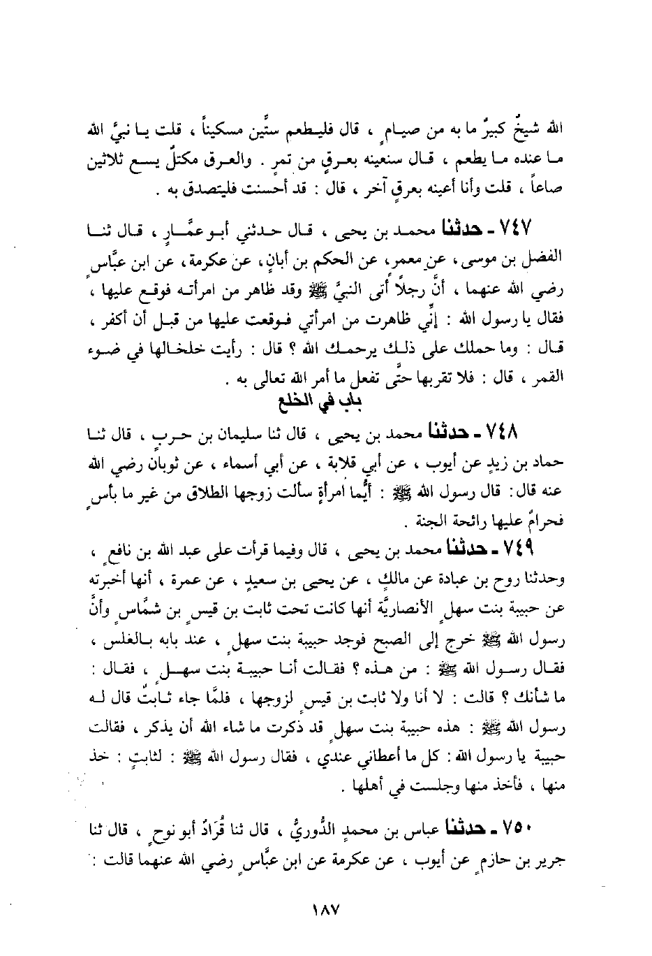 748 - حَدَّثَنَا مُحَمَّدُ بْنُ يَحْيَى، قَالَ: ثنا سُلَيْمَانُ بْنُ حَرْبٍ، قَالَ: ثنا حَمَّادُ بْنُ زَيْدٍ، عَنْ أَيُّوبَ، عَنْ أَبِي قِلَابَةَ، عَنْ أَبِي أَسْمَاءَ، عَنْ ثَوْبَانَ، رَضِيَ اللَّهُ عَنْهُ قَالَ: قَالَ رَسُولُ اللَّهِ صَلَّى اللهُ عَلَيْهِ وَسَلَّمَ: «§أَيُّمَا امْرَأَةٍ سَأَلَتْ زَوْجَهَا الطَّلَاقَ مِنْ غَيْرِ مَا بَأْسٍ فَحَرَامٌ عَلَيْهَا رَائِحَةُ الْجَنَّةِ»