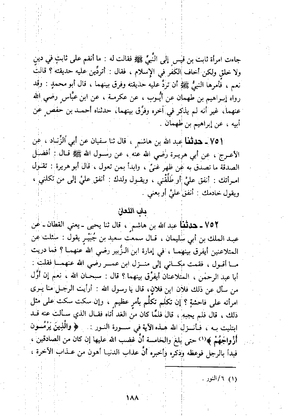 752 - حَدَّثَنَا عَبْدُ اللَّهِ بْنُ هَاشِمٍ، قَالَ: ثنا يَحْيَى يَعْنِي الْقَطَّانَ، عَنْ عَبْدِ الْمَلِكِ بْنِ أَبِي سُلَيْمَانَ، قَالَ: سَمِعْتُ سَعِيدَ بْنَ جُبَيْرٍ، يَقُولُ: سُئِلَتْ عَنِ الْمُتَلَاعِنَيْنِ، أيُفَرَّقُ بَيْنَهُمَا، فِي إِمَارَةِ ابْنِ الزُّبَيْرِ رَضِيَ اللَّهُ عَنْهُمَا، فَمَا دَرَيْتُ مَا أَقُولُ فَقُمْتُ مَكَانِي إِلَى مَنْزِلِ ابْنِ عُمَرَ رَضِيَ اللَّهُ عَنْهُمَا، فَقُلْتُ: أَبَا عَبْدِ الرَّحْمَنِ الْمُتَلَاعِنَانِ أَيُفَرَّقُ بَيْنَهُمَا؟ قَالَ: " سُبْحَانَ اللَّهِ، نَعَمْ، إِنَّ أَوَّلَ مَنْ سَأَلَ عَنْ ذَلِكَ فُلَانُ بْنُ فُلَانٍ قَالَ: يَا رَسُولَ اللَّهِ §أَرَأَيْتَ الرَّجُلَ مِنَّا يَرَى امْرَأَتَهُ عَلَى فَاحِشَةٍ، إِنْ تَكَلَّمَ تَكَلَّمَ بِأَمْرٍ عَظِيمٍ، وَإِنْ سَكَتَ سَكَتَ عَلَى مِثْلِ ذَلِكَ قَالَ: فَلَمْ يُجِبْهُ، قَالَ: فَلَمَّا كَانَ مِنَ الْغَدِ أَتَاهُ فَقَالَ: الَّذِي سَأَلْتُ عَنْهُ قَدِ ابْتُلِيتُ بِهِ، فَأَنْزَلَ اللَّهُ هَذِهِ الْآيَةَ فِي سُورَةِ النُّورِ {وَالَّذِينَ يَرْمُونَ أَزْوَاجَهُمْ} [النور: 6] حَتَّى بَلَغَ {وَالْخَامِسَةَ أَنَّ غَضَبَ اللَّهِ عَلَيْهَا إِنْ كَانَ مِنَ الصَّادِقِينَ} [النور: 9] ، فَبَدَأَ بِالرَّجُلِ فَوَعَظَهُ وَذَكَّرَهُ وَأَخْبَرَهُ أَنَّ عَذَابَ الدُّنْيَا أَهْوَنُ مِنْ عَذَابِ الْآخِرَةِ، فَقَالَ: وَالَّذِي بَعَثَكَ بِالْحَقِّ مَا كَذَبْتُ، ثُمَّ ثَنَّى بِالْمَرْأَةِ فَوَعَظَهَا وَذَكَّرَهَا وَأَخْبَرَهَا أَنَّ عَذَابَ الدُّنْيَا أَهْوَنُ مِنْ عَذَابِ الْآخِرَةِ، فَقَالَتْ: وَالَّذِي بَعَثَكَ بِالْحَقِّ إِنَّهُ لَكَاذِبٌ قَالَ: فَبَدَأَ بِالرَّجُلِ فَتَشَهَّدَ أَرْبَعَ شَهَادَاتٍ بِاللَّهِ إِنَّهُ لِمَنْ الصَّادِقِينَ، وَالْخَامِسَةَ أَنَّ لَعْنَةَ اللَّهِ عَلَيْهِ إِنْ كَانَ مِنَ الْكَاذِبِينَ، ثُمَّ ثَنَّى بِالْمَرْأَةِ فَشَهِدَتْ أَرْبَعَ شَهَادَاتٍ بِاللَّهِ إِنَّهُ لِمَنْ الْكَاذِبِينَ، وَالْخَامِسَةَ أَنَّ غَضَبَ اللَّهِ عَلَيْهَا إِنْ كَانَ مِنَ الصَّادِقِينَ، ثُمَّ فَرَّقَ بَيْنَهُمَا "