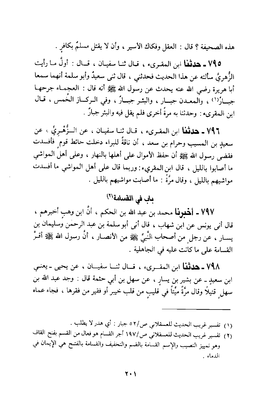 795 - حَدَّثَنَا ابْنُ الْمُقْرِئِ، قَالَ: ثنا سُفْيَانُ، قَالَ: أَوَّلُ مَا رَأَيْتُ الزُّهْرِيَّ سَأَلْتُهُ عَنْ هَذَا الْحَدِيثِ فَحَدَّثَنِي قَالَ: ثني سَعِيدٌ وَأَبُو سَلَمَةَ، أَنَّهُمَا سَمِعَا أَبَا هُرَيْرَةَ رَضِيَ اللَّهُ عَنْهُ يُحَدِّثُ، عَنْ رَسُولِ اللَّهِ صَلَّى اللهُ عَلَيْهِ وَسَلَّمَ أَنَّهُ قَالَ: «§الْعَجْمَاءُ جَرْحُهَا جُبَارٌ، وَالْمَعْدِنُ جُبَارٌ، وَالْبِئْرُ جُبَارٌ، وَفِي الرِّكَازِ الْخُمُسُ» قَالَ ابْنُ الْمُقْرِئِ: وَحَدَّثَنَا بِهِ مَرَّةً أُخْرَى، فَلَمْ يَقُلْ فِيهِ: وَالْبِئْرُ جُبَارٌ