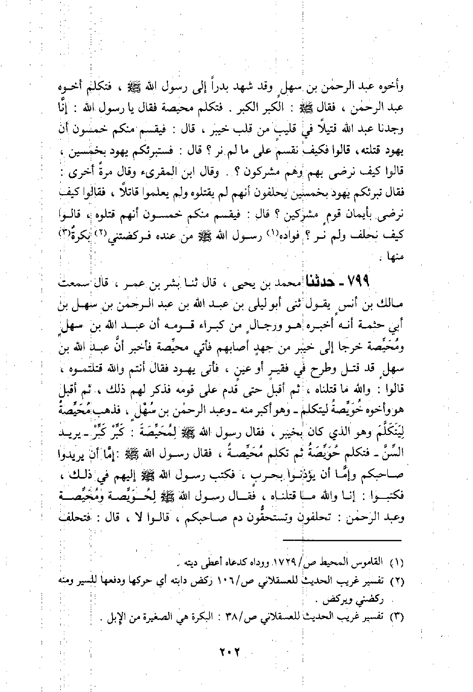 799 - حَدَّثَنَا مُحَمَّدُ بْنُ يَحْيَى، قَالَ: ثنا بِشْرُ بْنُ عُمَرَ، قَالَ: سَمِعْتُ مَالِكَ بْنَ أَنَسٍ، يَقُولُ: ثني أَبُو لَيْلَى بْنُ عَبْدِ اللَّهِ بْنِ عَبْدِ الرَّحْمَنِ بْنِ سَهْلِ بْنِ أَبِي حَثْمَةَ، أَنَّهُ أَخْبَرَهُ، عَنْ رِجَالٍ مِنْ كُبَرَاءِ قَوْمِهِ، أَنَّ عَبْدَ اللَّهِ بْنَ سَهْلٍ، وَمُحَيِّصَةَ خَرَجَا إِلَى خَيْبَرَ مِنْ جُهْدٍ أَصَابَهُمْ، فَأُتِيَ مُحَيِّصَةُ فَأُخْبِرَ أَنَّ عَبْدَ اللَّهِ بْنَ سَهْلٍ قَدْ قُتِلَ وَطُرِحَ فِي قَفِيرٍ أَوْ عَيْنٍ، فَأَتَى يَهُودَ فَقَالَ: أَنْتُمْ وَاللَّهِ قَتَلْتُمُوهُ قَالُوا: وَاللَّهِ مَا قَتَلْنَاهُ، ثُمَّ أَقْبَلَ حَتَّى قَدِمَ عَلَى قَوْمِهِ فَذَكَرَ لَهُمْ ذَلِكَ، ثُمَّ أَقْبَلَ هُوَ وَأَخُوهُ حُوَيِّصَةُ وَهُوَ أَكْبَرُ وَعَبْدُ الرَّحْمَنِ بْنُ سَهْلٍ فَذَهَبَ مُحَيِّصَةُ لَيَتَكَلَّمَ وَهُوَ الَّذِي كَانَ بِخَيْبَرَ، فَقَالَ رَسُولُ اللَّهِ صَلَّى اللهُ عَلَيْهِ وَسَلَّمَ لِمُحَيِّصَةَ: «§كَبِّرْ كَبِّرْ» ، يُرِيدُ السِّنَّ فَتَكَلَّمَ حُوَيِّصَةُ ثُمَّ تَكَلَّمَ مُحَيِّصَةُ، فَقَالَ رَسُولُ اللَّهِ صَلَّى اللهُ عَلَيْهِ وَسَلَّمَ: " إِمَّا أَنْ يَدُوا صَاحِبَكُمْ، وَإِمَّا أَنْ يُؤْذِنُوا بِحَرْبٍ، فَكَتَبَ رَسُولُ اللَّهِ صَلَّى اللهُ عَلَيْهِ وَسَلَّمَ إِلَيْهِمْ فِي ذَلِكَ، فَكَتَبُوا: إِنَّا وَاللَّهِ مَا قَتَلْنَاهُ، فَقَالَ رَسُولُ اللَّهِ صَلَّى اللهُ عَلَيْهِ وَسَلَّمَ لِحُوَيِّصَةَ، وَمُحَيِّصَةَ، وَعَبْدِ الرَّحْمَنِ: «تَحْلِفُونَ وَتَسْتَحِقُّونَ دَمَ صَاحِبِكُمْ؟» قَالُوا: لَا، قَالَ: «فَتَحْلِفُ لَكُمْ يَهُودُ؟» قَالُوا: لَيْسُوا مُسْلِمَيْنِ فَوَدَاهُ رَسُولُ اللَّهِ صَلَّى اللهُ عَلَيْهِ وَسَلَّمَ مِنْ عِنْدِهِ فَبَعَثَ إِلَيْهِمْ رَسُولُ اللَّهِ صَلَّى اللهُ عَلَيْهِ وَسَلَّمَ بِمِائَةِ نَاقَةٍ حَتَّى أُدْخِلَتْ عَلَيْهِمْ فِي الدَّارِ قَالَ سَهْلٌ: فَلَقَدْ رَكَضَتْنِي مِنْهَا نَاقَةٌ حَمْرَاءُ