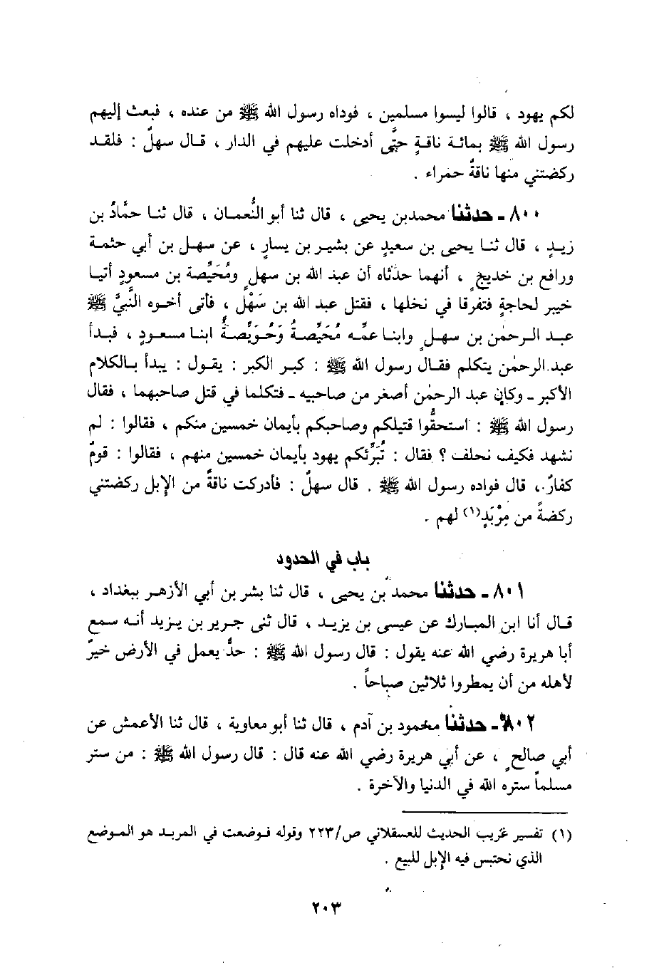 800 - حَدَّثَنَا مُحَمَّدُ بْنُ يَحْيَى، قَالَ: ثنا أَبُو النُّعْمَانِ، قَالَ: ثنا حَمَّادُ بْنُ زَيْدٍ، قَالَ: ثنا يَحْيَى بْنُ سَعِيدٍ، عَنْ بَشِيرِ بْنِ يَسَارٍ، عَنْ سَهْلِ بْنِ أَبِي حَثْمَةَ، وَرَافِعِ بْنِ خَدِيجٍ، أَنَّهُمَا حَدَّثَاهُ أَنَّ عَبْدَ اللَّهِ بْنَ سَهْلٍ، وَمُحَيِّصَةَ بْنَ مَسْعُودٍ، أَتَيَا خَيْبَرَ لِحَاجَةٍ، فَتَفَرَّقَا فِي نَخْلِهَا فَقُتِلَ عَبْدُ اللَّهِ بْنُ سَهْلٍ، فَأَتَى أَخُوهُ النَّبِيَّ صَلَّى اللهُ عَلَيْهِ وَسَلَّمَ عَبْدُ الرَّحْمَنِ بْنُ سَهْلٍ، وَابْنَا عَمِّهِ مُحَيِّصَةُ وَحُوَيِّصَةُ ابْنَا مَسْعُودٍ فَبَدَأَ عَبْدُ الرَّحْمَنِ يَتَكَلَّمُ، فَقَالَ رَسُولُ اللَّهِ: «§كَبِّرِ الْكُبْرَ» ، يَقُولُ: يَبْدَأُ بِالْكَلَامِ الْأَكْبَرُ وَكَانَ عَبْدُ الرَّحْمَنِ أَصْغَرَ مِنْ صَاحِبَيْهِ، فَتَكَلَّمَا فِي قَتْلِ صَاحِبِهِمَا، فَقَالَ رَسُولُ اللَّهِ صَلَّى اللهُ عَلَيْهِ وَسَلَّمَ: «اسْتَحِقُّوا قَتِيلَكُمْ وَصَاحِبَكُمْ بِأَيْمَانِ خَمْسِينَ مِنْكُمْ» ، فَقَالُوا: لَمْ نَشْهَدْ فَكَيْفَ نَحْلِفُ؟ فَقَالَ: «تُبَرِّئُكُمْ يَهُودُ بِأَيْمَانِ خَمْسِينَ مِنْهُمْ» ، فَقَالُوا: قَوْمٌ كُفَّارٌ قَالَ: فَوَادَهُ رَسُولُ اللَّهِ صَلَّى اللهُ عَلَيْهِ وَسَلَّمَ قَالَ سَهْلٌ: فَأَدْرَكْتُ نَاقَةً مِنَ الْإِبِلِ رَكَضَتْنِي رَكْضَةً مِنْ مِرْبَدٍ لَهُمْ