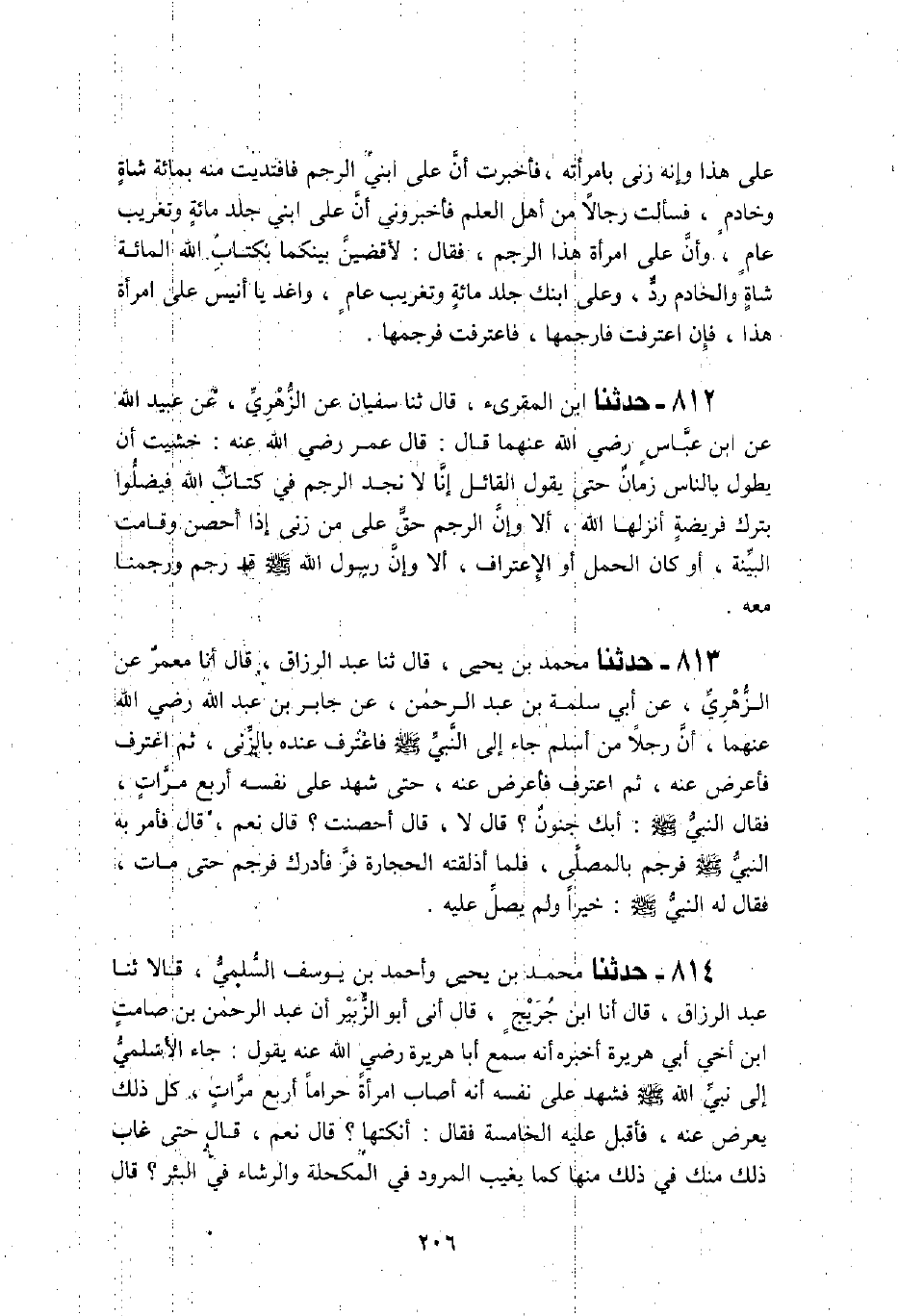813 - حَدَّثَنَا مُحَمَّدُ بْنُ يَحْيَى، قَالَ: ثنا عَبْدُ الرَّزَّاقِ، قَالَ: أنا مَعْمَرٌ، عَنِ الزُّهْرِيِّ، عَنْ أَبِي سَلَمَةَ بْنِ عَبْدِ الرَّحْمَنِ، عَنْ جَابِرِ بْنِ عَبْدِ اللَّهِ، رَضِيَ اللَّهُ عَنْهُمَا أَنَّ رَجُلًا مِنْ أَسْلَمَ جَاءَ إِلَى النَّبِيِّ صَلَّى اللهُ عَلَيْهِ وَسَلَّمَ فَاعْتَرَفَ عِنْدَهُ بِالزِّنَى، ثُمَّ اعْتَرَفَ فَأَعْرَضَ عَنْهُ، ثُمَّ اعْتَرَفَ فَأَعْرَضَ عَنْهُ، حَتَّى شَهِدَ عَلَى نَفْسِهِ أَرْبَعَ مَرَّاتٍ، فَقَالَ النَّبِيُّ صَلَّى اللهُ عَلَيْهِ وَسَلَّمَ: «§أَبِكَ جُنُونٌ؟» قَالَ: لَا قَالَ: «أَحْصَنْتَ؟» قَالَ: نَعَمْ قَالَ: فَأَمَرَ بِهِ النَّبِيُّ صَلَّى اللهُ عَلَيْهِ وَسَلَّمَ فَرُجِمَ بِالْمُصَلَّى، فَلَمَّا أَذْلَقَتْهُ الْحِجَارَةُ فَرَّ، فَأُدْرِكَ فَرُجِمَ حَتَّى مَاتَ، فَقَالَ لَهُ النَّبِيُّ صَلَّى اللهُ عَلَيْهِ وَسَلَّمَ خَيْرًا وَلَمْ يُصَلِّ عَلَيْهِ