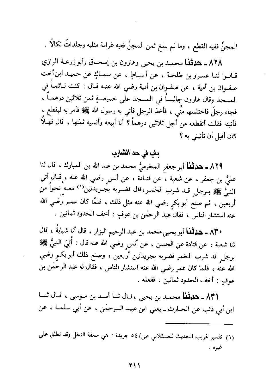 830 - حَدَّثَنَا أَبُو يَحْيَى مُحَمَّدُ بْنُ عَبْدِ الرَّحِيمِ الْبَزَّازُ قَالَ: أنا شَبَابَةُ، قَالَ: ثنا شُعْبَةُ، عَنْ قَتَادَةَ، عَنِ الْحَسَنِ، عَنْ أَنَسٍ، رَضِيَ اللَّهُ عَنْهُ قَالَ: §أُتِيَ النَّبِيُّ صَلَّى اللهُ عَلَيْهِ وَسَلَّمَ بِرَجُلٍ قَدْ شَرِبَ الْخَمْرَ، فَضَرَبَهُ بِجَرِيدَتَيْنِ أَرْبَعِينَ، وَصَنَعَ ذَلِكَ أَبُو بَكْرٍ رَضِيَ اللَّهُ عَنْهُ، فَلَمَّا كَانَ عُمَرُ رَضِيَ اللَّهُ عَنْهُ اسْتَشَارَ النَّاسَ فَقَالَ لَهُ عَبْدُ الرَّحْمَنِ بْنُ عَوْفٍ: أَخَفُّ الْحُدُودِ ثَمَانِينَ، فَفَعَلَهُ