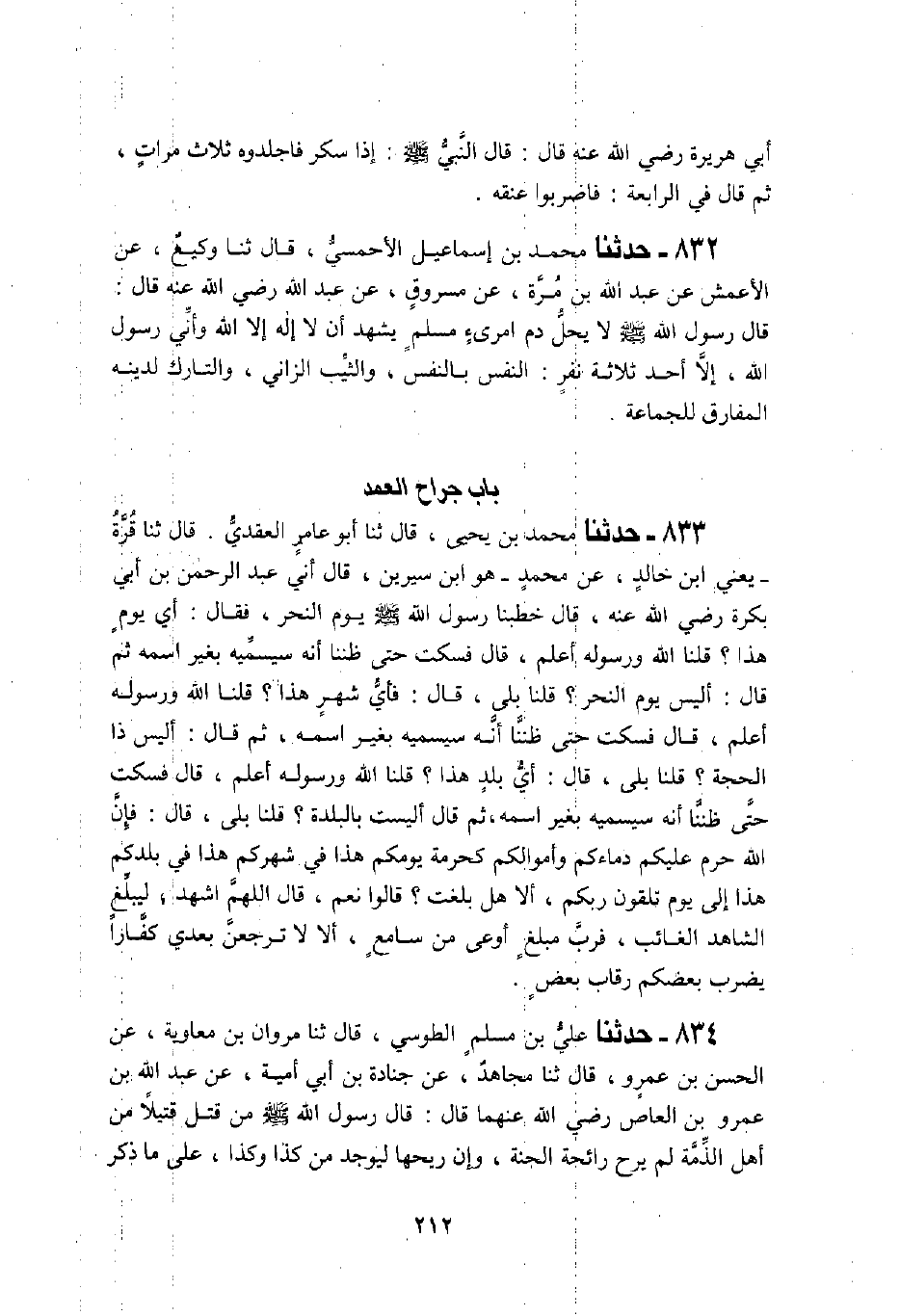 832 - حَدَّثَنَا مُحَمَّدُ بْنُ إِسْمَاعِيلَ الْأَحْمَسِيُّ، قَالَ: ثنا وَكِيعٌ، عَنِ الْأَعْمَشِ، عَنْ عَبْدِ اللَّهِ بْنِ مُرَّةَ، عَنْ مَسْرُوقٍ، عَنْ عَبْدِ اللَّهِ، رَضِيَ اللَّهُ عَنْهُ قَالَ: قَالَ رَسُولُ اللَّهِ صَلَّى اللهُ عَلَيْهِ وَسَلَّمَ: " §لَا يَحِلُّ دَمُ امْرِئٍ مُسْلِمٍ يَشْهَدُ أَنْ لَا إِلَهَ إِلَّا اللَّهُ، وَإِنِّي رَسُولُ اللَّهِ إِلَّا أَحَدُ ثَلَاثَةِ نَفَرٍ: النَّفْسُ بِالنَّفْسِ، وَالثَّيِّبُ الزَّانِي، وَالتَّارِكُ لِدِينِهِ الْمُفَارِقُ لِلْجَمَاعَةِ "