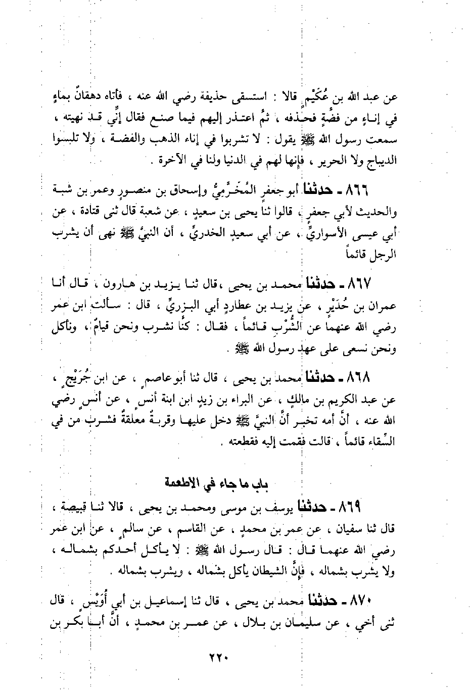 867 - حَدَّثَنَا مُحَمَّدُ بْنُ يَحْيَى، قَالَ: ثنا يَزِيدُ بْنُ هَارُونَ، قَالَ: أنا عِمْرَانُ ابْنُ حُدَيْرٍ، عَنْ يَزِيدَ بْنِ عُطَارِدٍ أَبِي الْبَزَرِيِّ، قَالَ: سَأَلْتُ ابْنَ عُمَرَ رَضِيَ اللَّهُ عَنْهُمَا عَنِ الشُّرْبِ قَائِمًا، فَقَالَ: " §كُنَّا نَشْرَبُ وَنَحْنُ قِيَامٌ، وَنَأْكُلُ وَنَحْنُ نَسْعَى عَلَى عَهْدِ رَسُولِ اللَّهِ صَلَّى اللهُ عَلَيْهِ وَسَلَّمَ