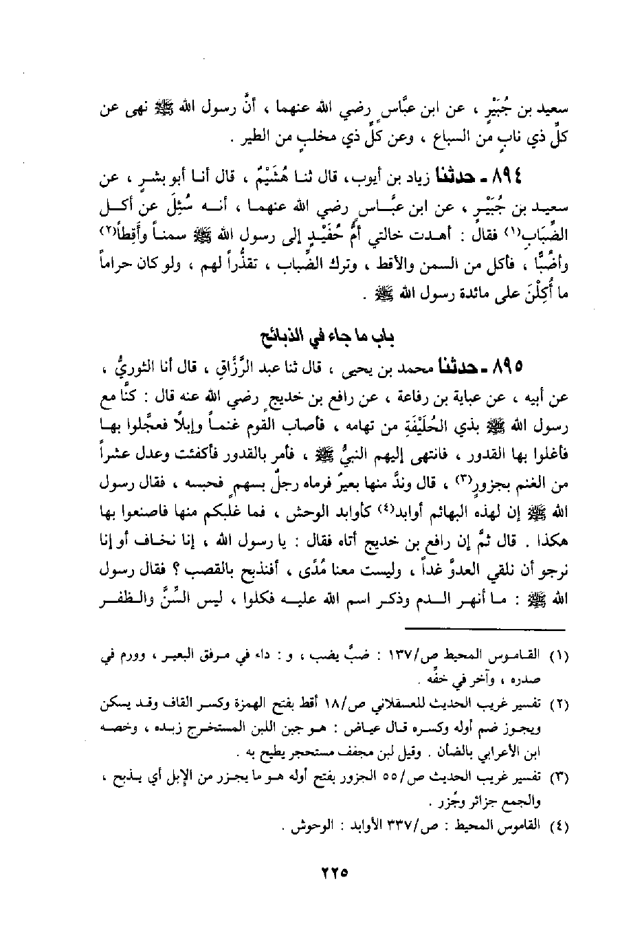 895 - حَدَّثَنَا مُحَمَّدُ بْنُ يَحْيَى، قَالَ: ثنا عَبْدُ الرَّزَّاقِ، قَالَ: أنا الثَّوْرِيُّ، عَنْ أَبِيهِ، عَنْ عَبَايَةَ بْنِ رِفَاعَةَ، عَنْ رَافِعِ بْنِ خَدِيجٍ، رَضِيَ اللَّهُ عَنْهُ قَالَ: كُنَّا مَعَ رَسُولِ اللَّهِ صَلَّى اللهُ عَلَيْهِ وَسَلَّمَ بِذِي الْحُلَيْفَةِ مِنْ تِهَامَةَ، فَأَصَابَ الْقَوْمُ غَنَمًا وَإِبِلًا، فَعَجَّلُوا بِهَا، فَأَغْلَوْا بِهَا الْقُدُورَ، فَانْتَهَى إِلَيْهِمُ النَّبِيُّ صَلَّى اللهُ عَلَيْهِ وَسَلَّمَ فَأَمَرَ، بِالْقُدُورِ فَأُكْفِئَتْ وَعَدَلَ عَشْرًا مِنَ الْغَنَمِ بِجَزُورٍ، قَالَ: وَنَدَّ مِنْهَا بَعِيرٌ، فَرَمَاهُ الرَّجُلُ بِسَهْمٍ فَحَبَسَهُ، فَقَالَ رَسُولُ اللَّهِ صَلَّى اللهُ عَلَيْهِ وَسَلَّمَ: «إِنَّ لِهَذِهِ الْبَهَائِمِ أَوَابِدَ كَأَوَابِدِ الْوَحْشِ، فَمَا غَلَبَكُمْ مِنْهَا فَاصْنَعُوا بِهَا هَكَذَا» ، قَالَ: ثُمَّ إِنَّ رَافِعَ بْنَ خَدِيجٍ أَتَاهُ فَقَالَ: يَا رَسُولَ اللَّهِ صَلَّى اللهُ عَلَيْهِ وَسَلَّمَ إِنَّا نَخَافُ، أَوْ إِنَّا نَرْجُوا أَنْ نَلْقَى الْعَدُوَّ غَدًا وَلَيْسَ مَعَنَا مُدًى، أَفَنَذْبَحُ بِالْقَصَبِ؟ فَقَالَ رَسُولُ اللَّهِ صَلَّى اللهُ عَلَيْهِ وَسَلَّمَ: «§مَا أَنْهَرَ الدَّمَ، وَذُكِرَ اسْمُ اللَّهِ عَلَيْهِ، فَكُلُوا لَيْسَ السِّنَّ وَالظُّفُرَ، وَسَأُحَدِّثُكُمْ فَأَمَّا السِّنُّ فَعَظْمٌ، وَأَمَّا الظُّفُرُ فَمُدَى الْحَبَشَةِ» ، ثُمَّ قَالَ: إِنَّ نَاضِحًا تَرَدَّى فِي بِئْرٍ بِالْمَدِينَةِ فَذُكِّيَ مِنْ قِبَلِ شَاكِلَتِهِ يَعْنِي خَاصِرَتَهُ فَأَخَذَ مِنْهُ ابْنُ عُمَرَ رَضِيَ اللَّهُ عَنْهُمَا عَشِيرًا بِدِرْهَمَيْنِ