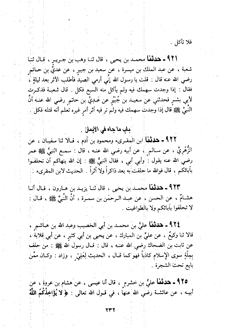 921 - حَدَّثَنَا مُحَمَّدُ بْنُ يَحْيَى، قَالَ: ثنا وَهْبُ بْنُ جَرِيرٍ، قَالَ: ثنا شُعْبَةُ، عَنْ عَبْدِ الْمَلِكِ بْنِ مَيْسَرَةَ، عَنْ سَعِيدِ بْنِ جُبَيْرٍ، عَنْ عَدِيِّ بْنِ حَاتِمٍ، رَضِيَ اللَّهُ عَنْهُ قَالَ: قُلْتُ: يَا رَسُولَ اللَّهِ إِنِّي أَرْمِي الصَّيْدَ فَأَطْلُبُ الْأَثَرَ بَعْدَ لَيْلَةٍ؟ فَقَالَ: «§إِذَا وَجَدْتَ سَهْمَكَ فِيهِ وَلَمْ يَأْكُلْ مِنْهُ السَّبُعُ فَكُلْ» ، قَالَ شُعْبَةُ: فَذَكَرْتُ لِأَبِي بِشْرٍ فَحَدَّثَنِي، عَنُ سَعِيدِ بْنِ جُبَيْرٍ، عَنْ عَدِيِّ بْنِ حَاتِمٍ رَضِيَ اللَّهُ عَنْهُ أَنَّ النَّبِيَّ صَلَّى اللهُ عَلَيْهِ وَسَلَّمَ قَالَ: «إِذَا وَجَدْتَ سَهْمَكَ فِيهِ، وَلَمْ تَرَ فِيهِ أَثَرَ أَمْرٍ غَيْرِهِ تَعْلَمُ أَنَّهُ قَتَلَهُ فَكُلْ»
