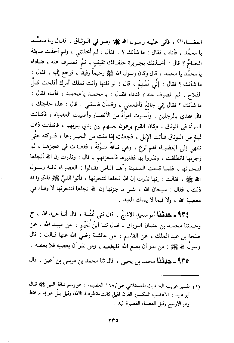 934 - حَدَّثَنَا أَبُو سَعِيدٍ الْأَشَجُّ، قَالَ: ثني عُتْبَةُ قَالَ: أنا عُبَيْدُ اللَّهِ، ح وَحَدَّثَنَا مُحَمَّدُ بْنُ عُثْمَانَ الْوَرَّاقُ، قَالَ: ثنا ابْنُ نُمَيْرٍ، عَنْ عُبَيْدِ اللَّهِ، عَنْ طَلْحَةَ بْنِ عَبْدِ الْمَلِكِ، عَنِ الْقَاسِمِ، عَنْ عَائِشَةَ، رَضِيَ اللَّهُ عَنْهَا قَالَتْ: قَالَ رَسُولُ اللَّهِ صَلَّى اللهُ عَلَيْهِ وَسَلَّمَ: «§مَنْ نَذَرَ أَنْ يُطِيعَ اللَّهَ فَلْيُطِعْهُ، وَمَنْ نَذَرَ أَنْ يَعْصِيَهُ فَلَا يَعْصِهِ»